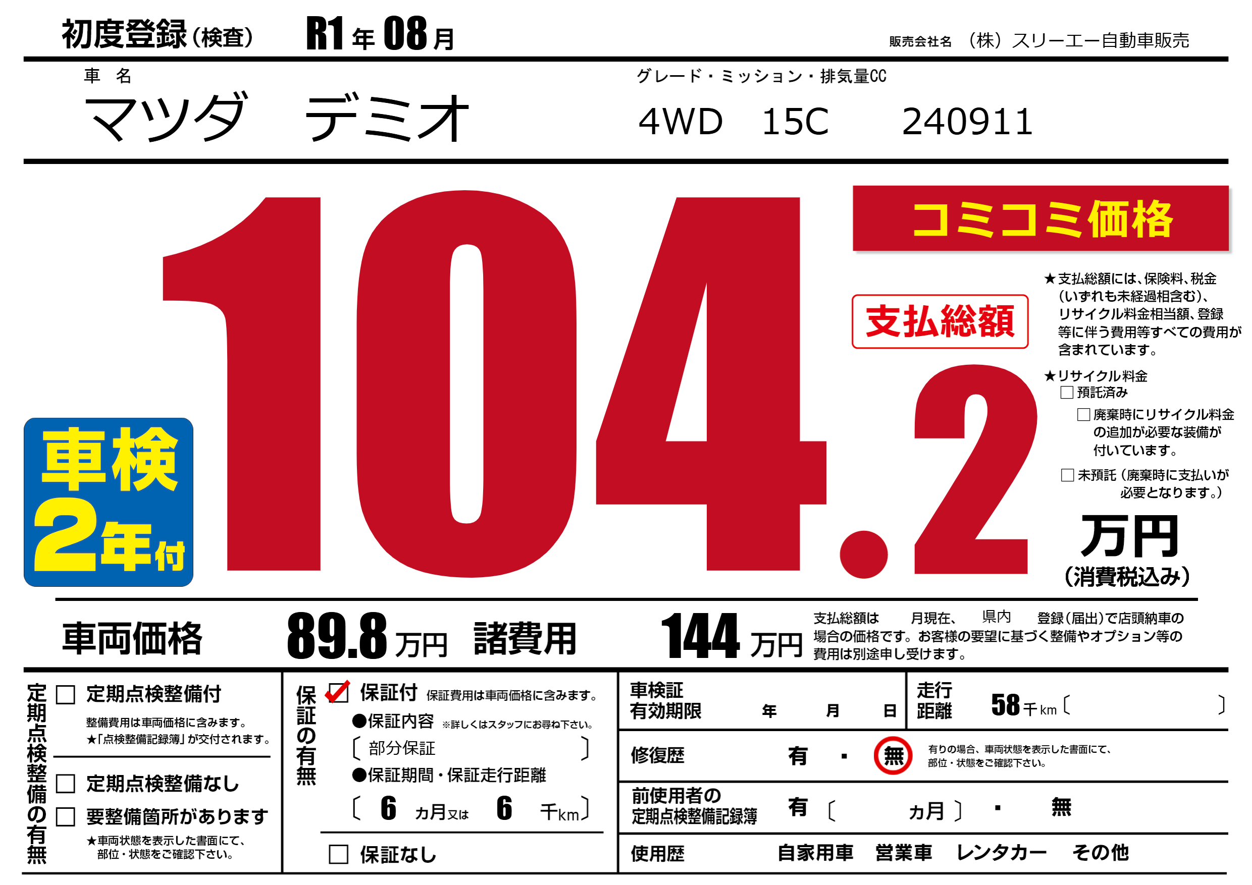保証付き 保証内容(部分保証) 6ヶ月または(6)千kmまで |