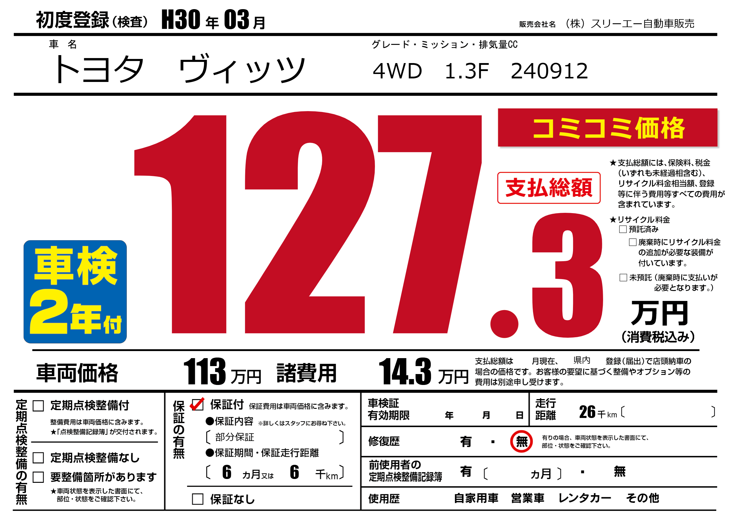 保証付き 保証内容(部分保証) 6ヶ月または(6)千kmまで |