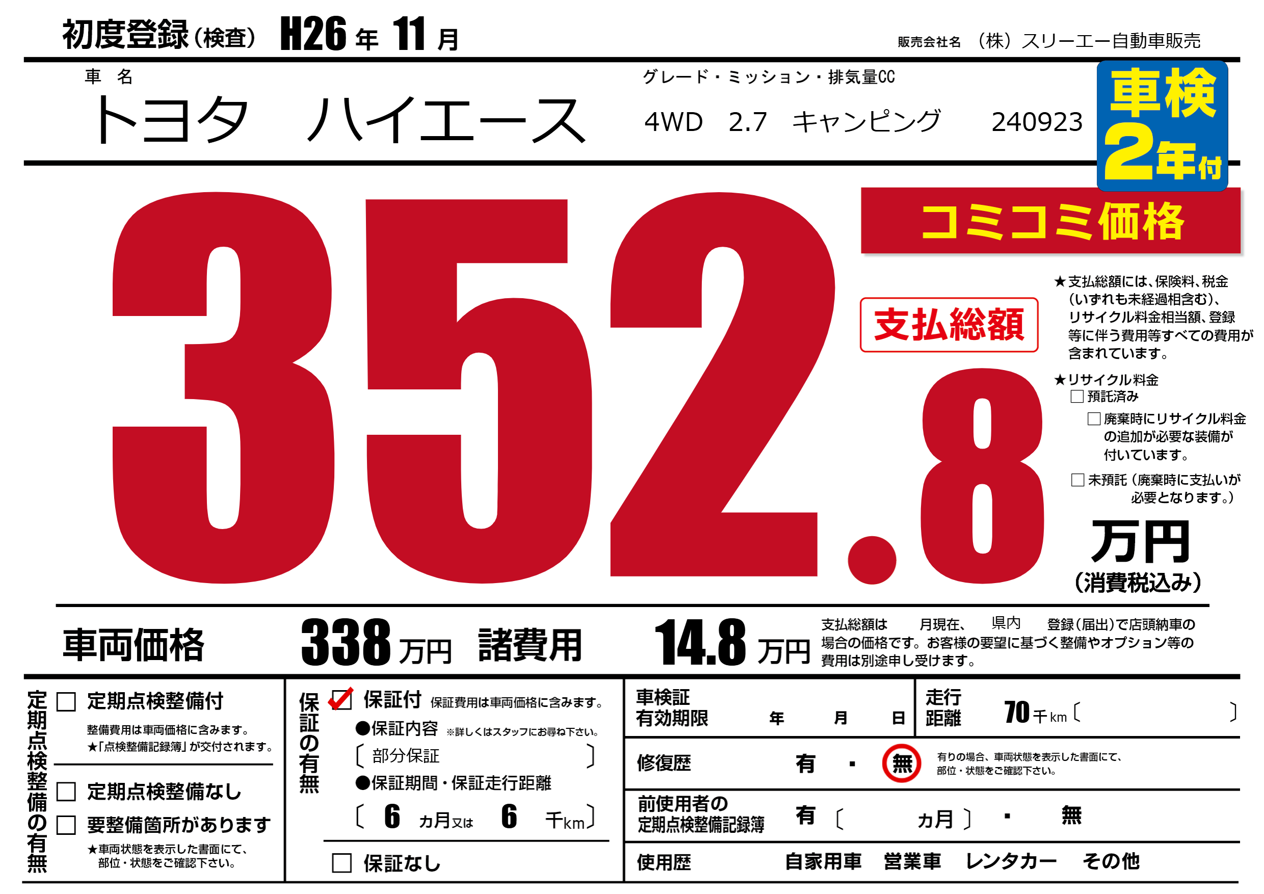 | 走行キロ | 7万km | 初年度登録 | H26年11月 |
