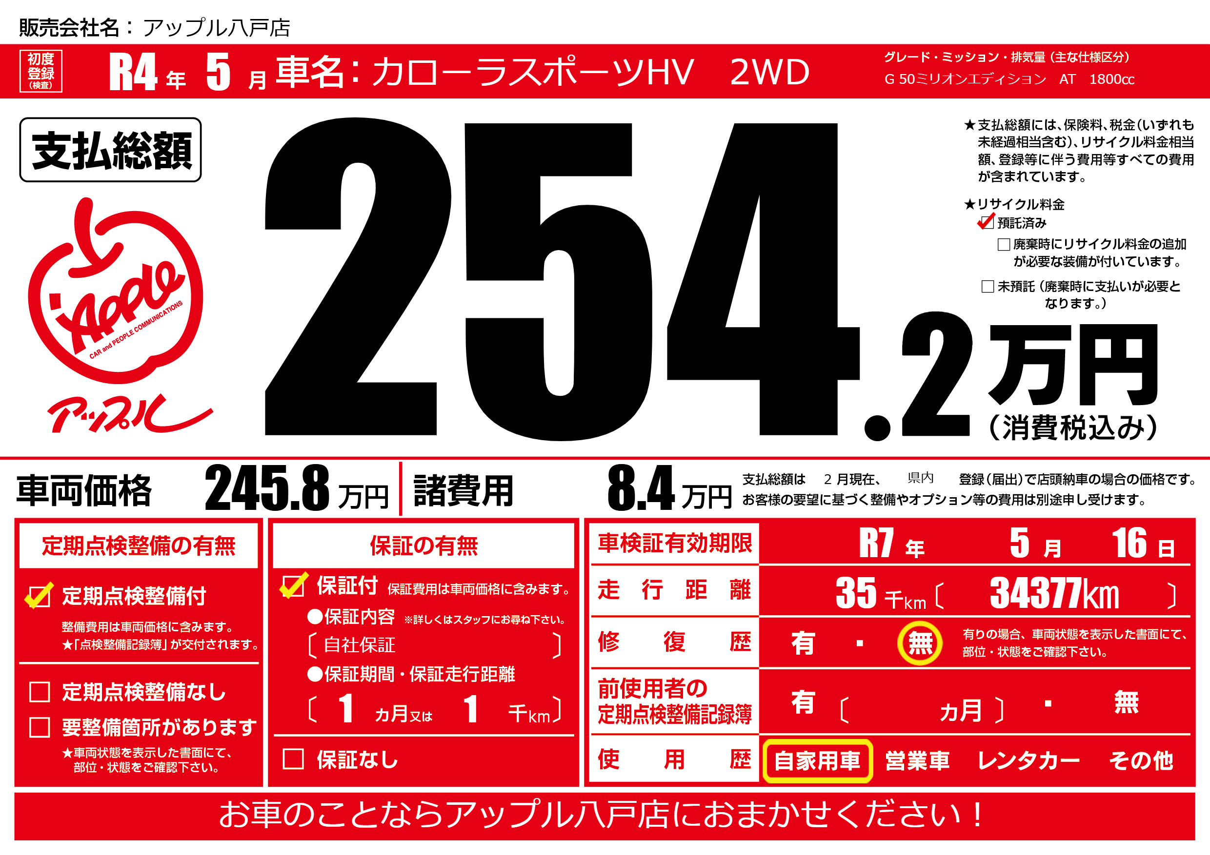 | 車名 | カローラスポーツHV 2WD | グレード ミッション 排気量 |