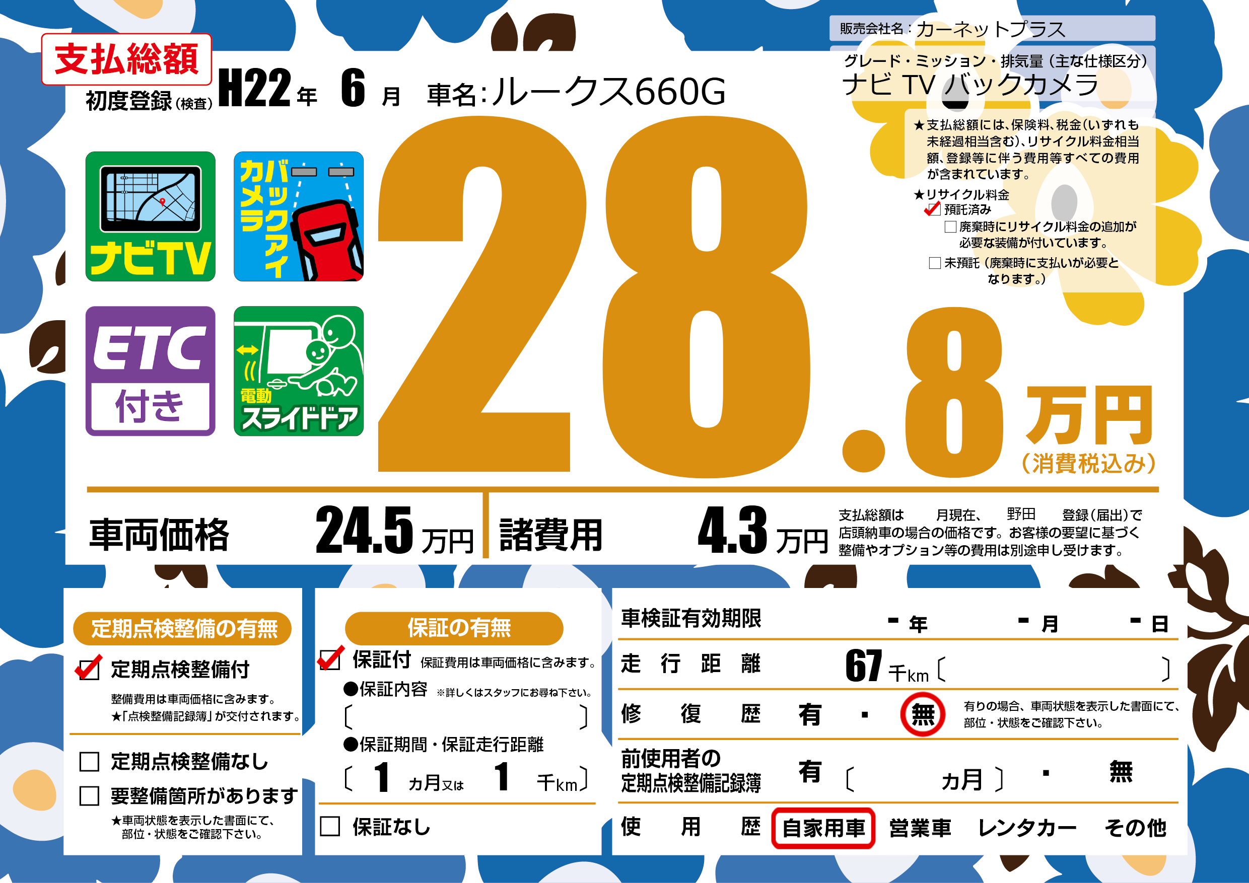 | 走行キロ | 6.7万km | 初年度登録 | H22年6月 |
