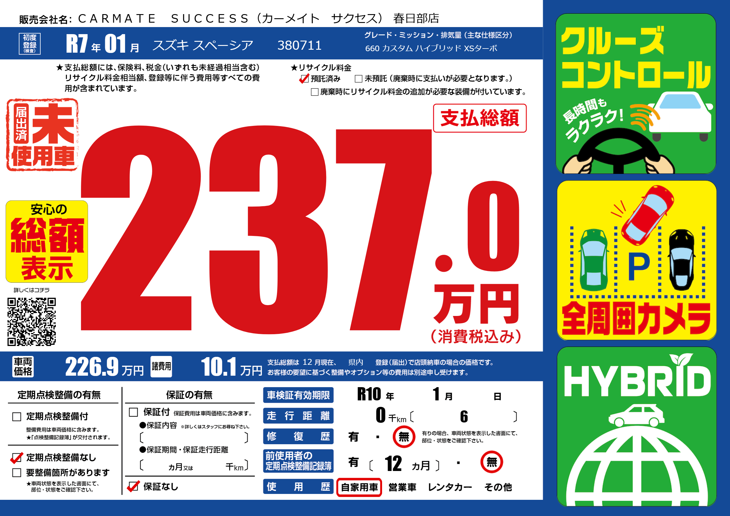 | 車名 | スズキ スペーシア 380711 | グレード ミッション 排気量 |