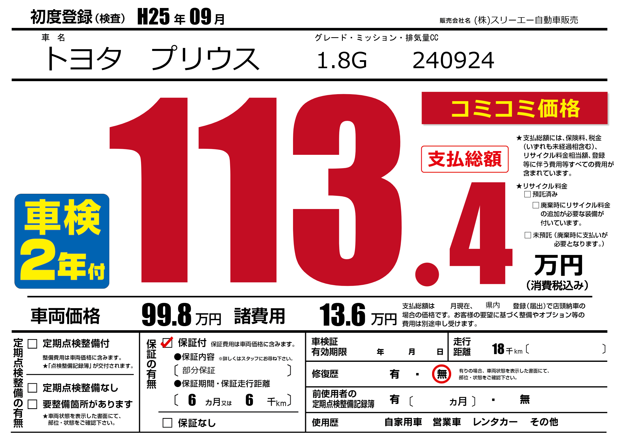 保証付き 保証内容(部分保証) 6ヶ月または(6)千kmまで |