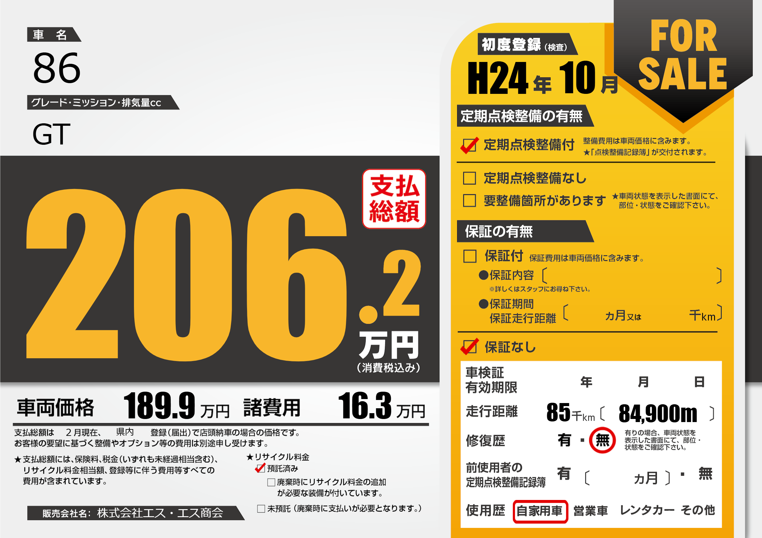 | 走行キロ | 8.5万km | 初年度登録 | H24年10月 |
