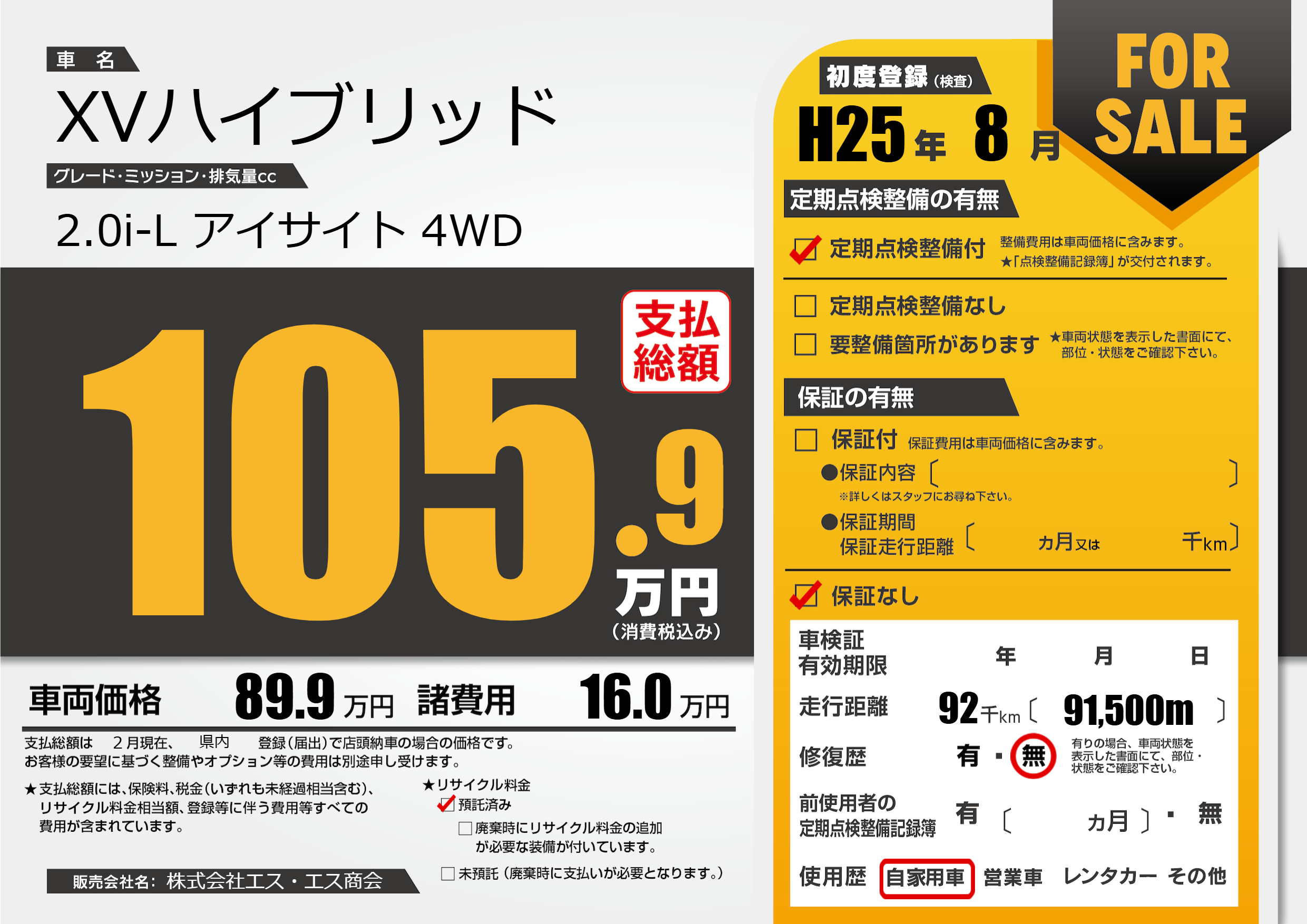 | 走行キロ | 9.2万km | 初年度登録 | H25年8月 |