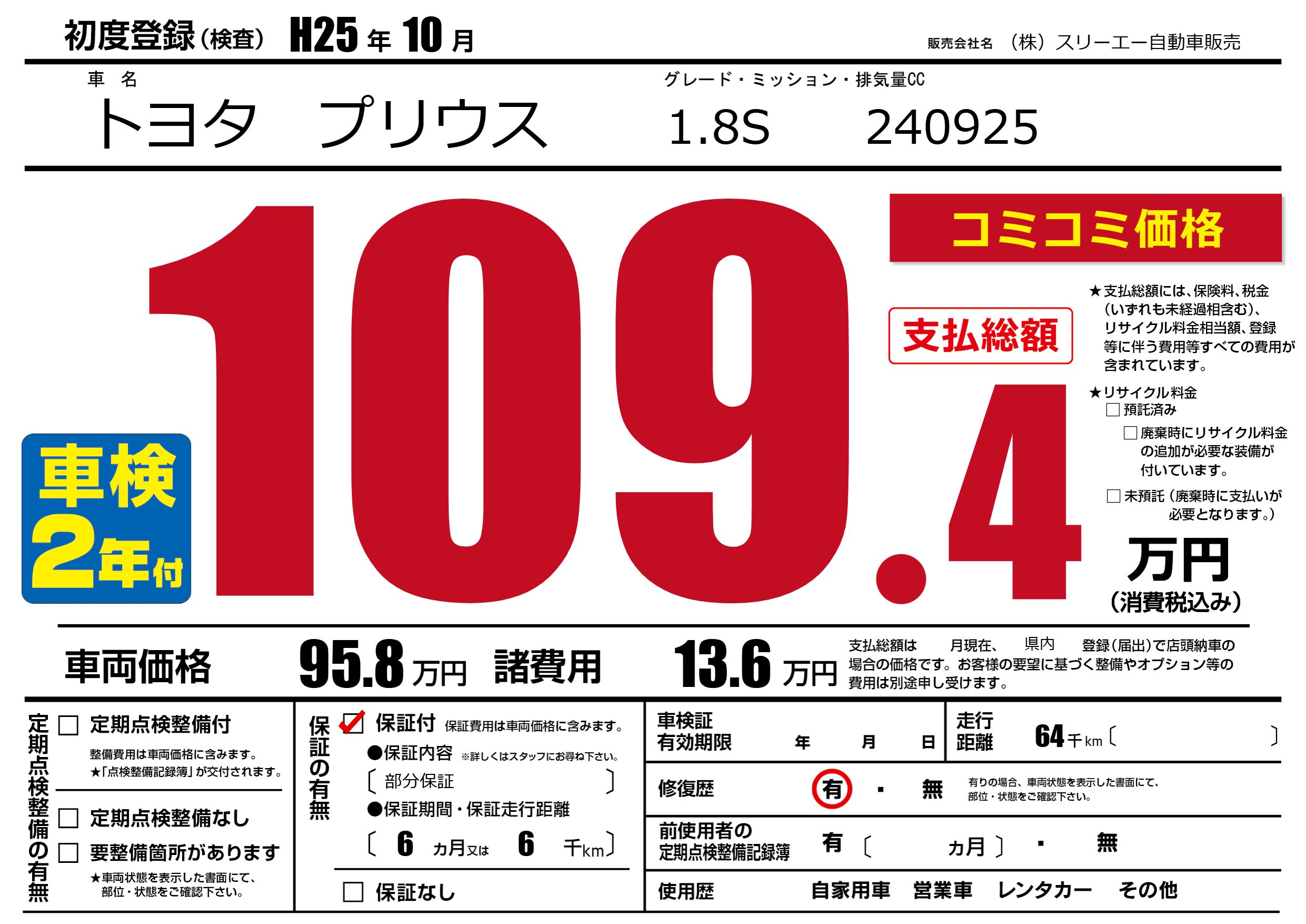 | 車名 | トヨタ プリウス | グレード ミッション 排気量 |