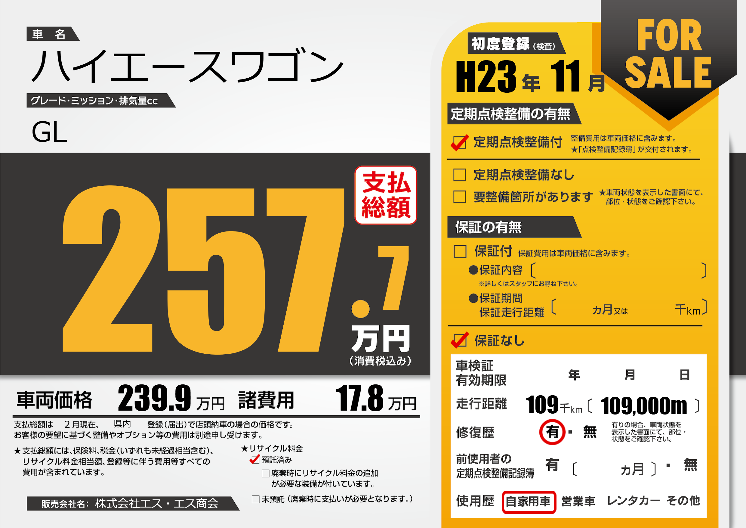 | 走行キロ | 10.9万km | 初年度登録 | H23年11月 |