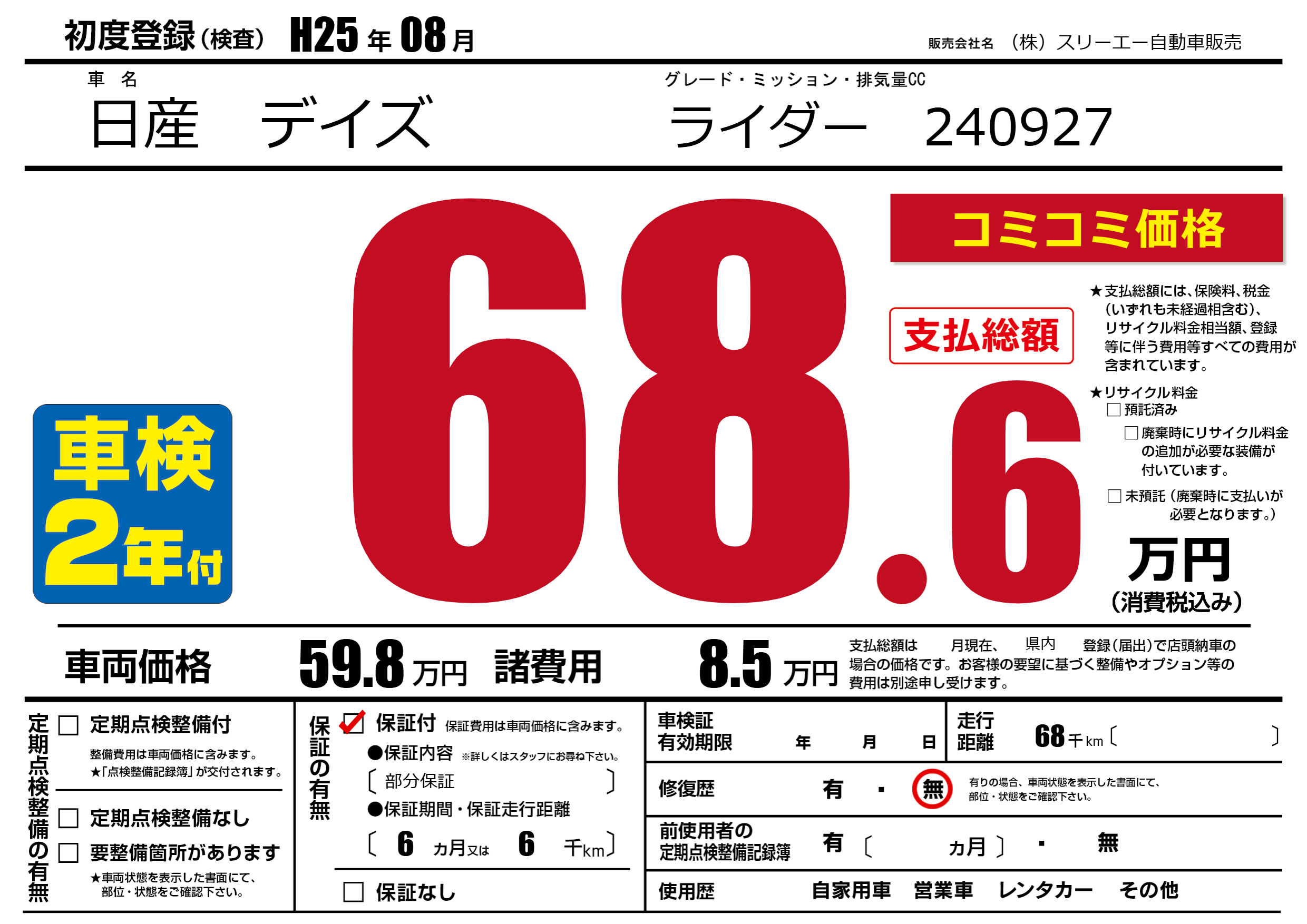 | 走行キロ | 6.8万km | 初年度登録 | H25年08月 |