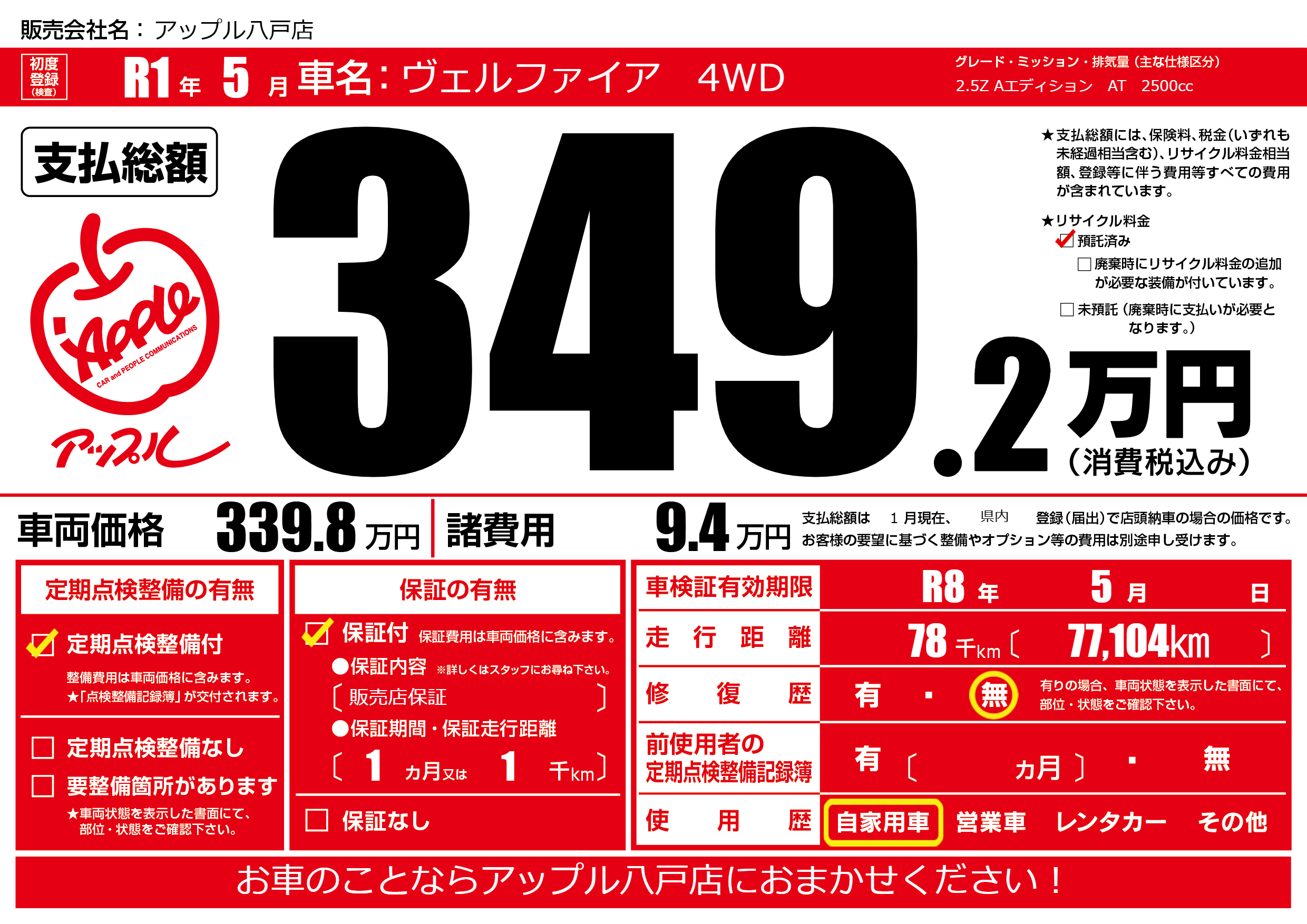 | 車名 | ヴェルファイア 4WD | グレード ミッション 排気量 |