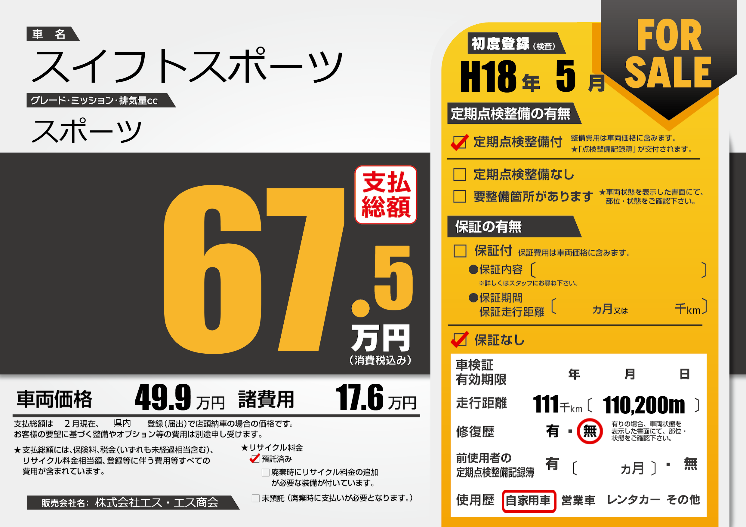 | 走行キロ | 11.1万km | 初年度登録 | H18年5月 |