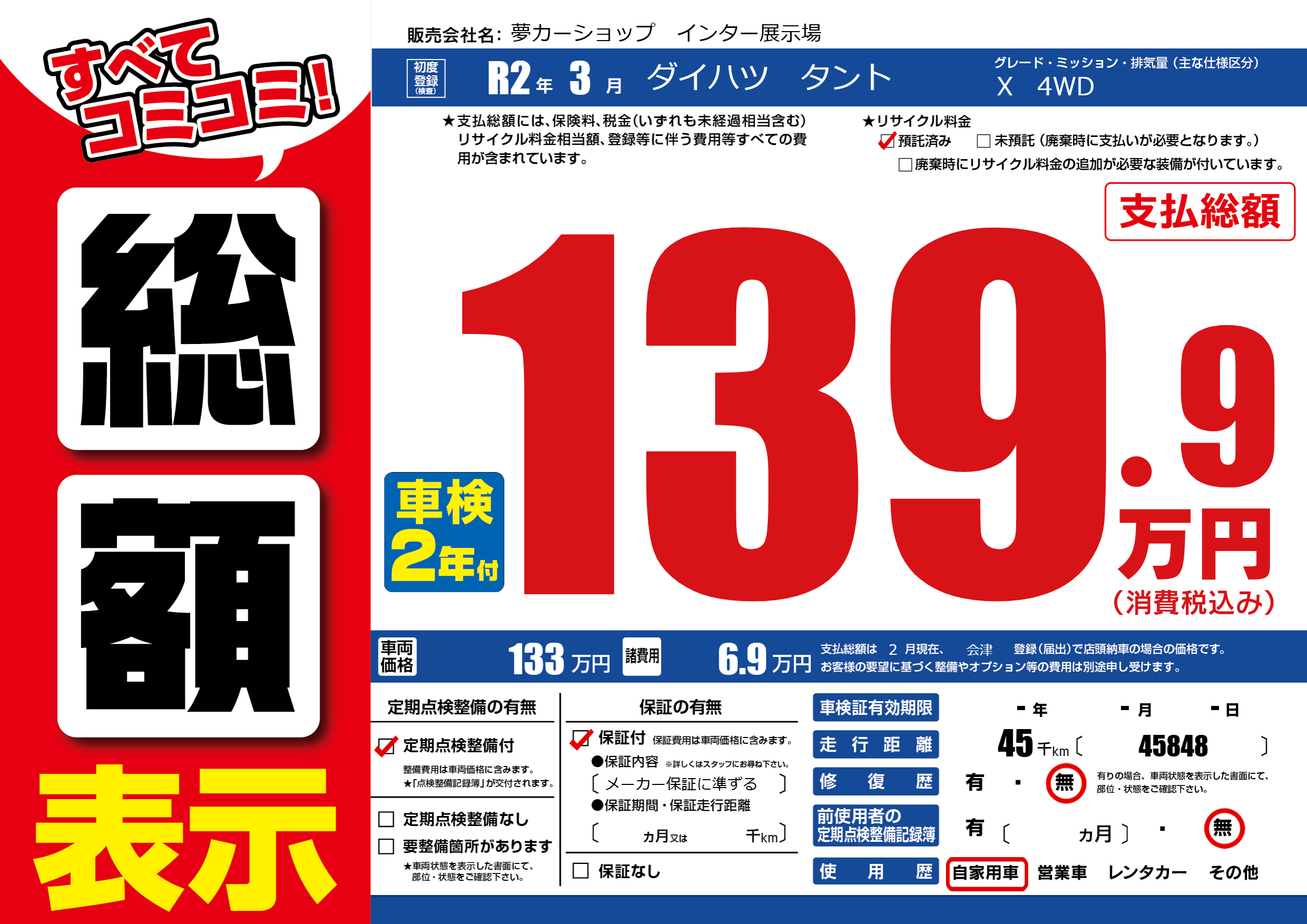 | 車名 | ダイハツ タント | グレード ミッション 排気量 |