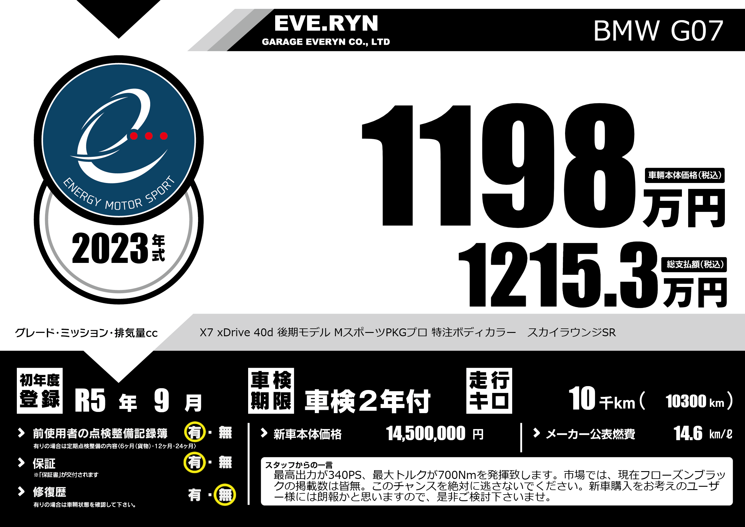 | 車名 | BMW G07 | グレード ミッション 排気量 |