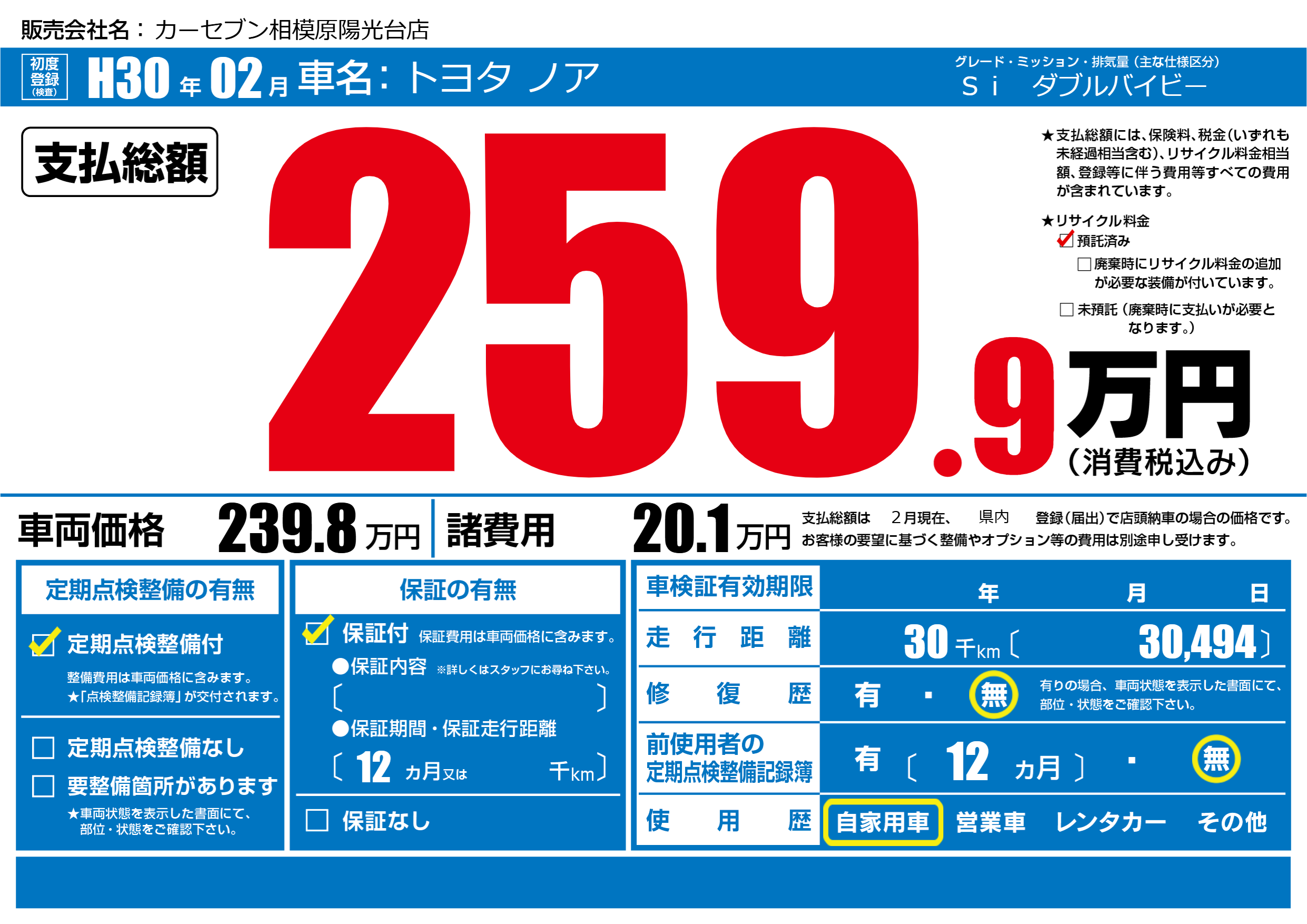 | 走行キロ | 3万km | 初年度登録 | H30年02月 |