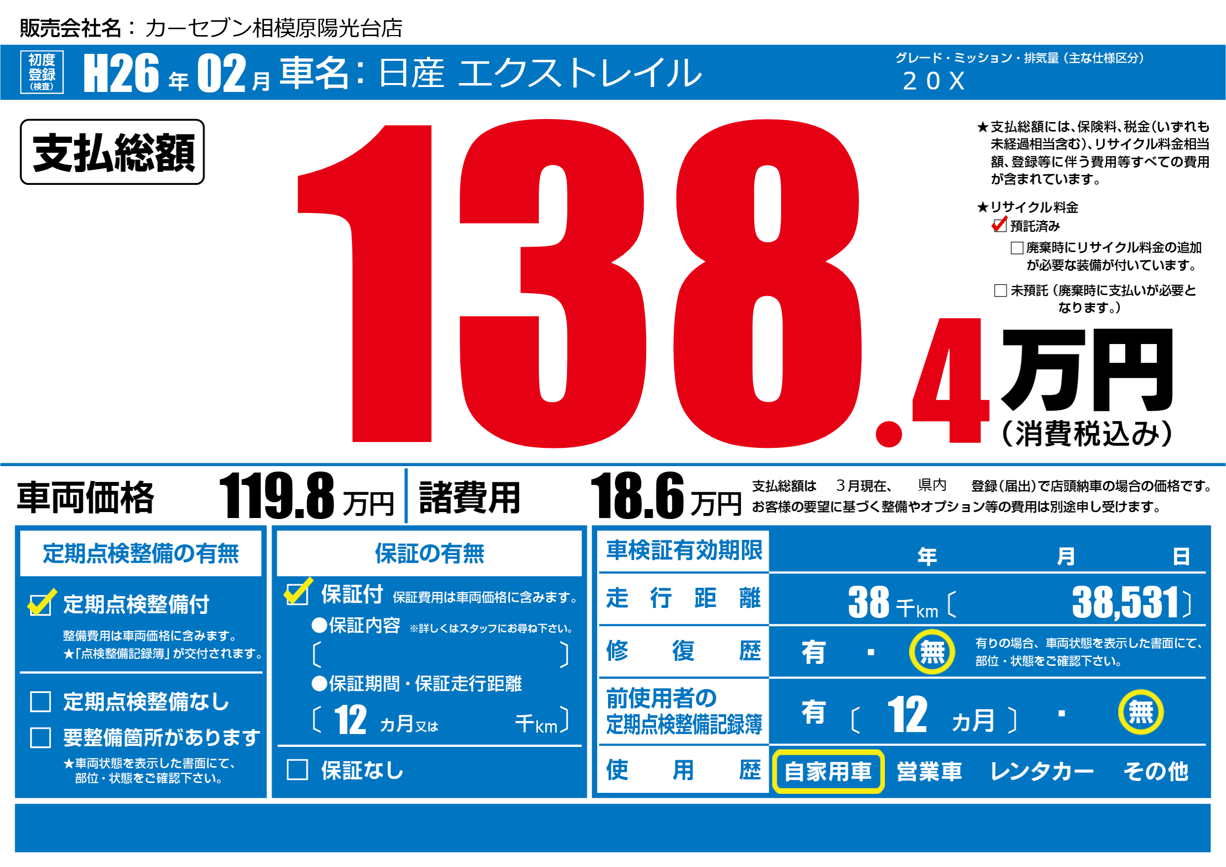 | 走行キロ | 3.8万km | 初年度登録 | H26年02月 |