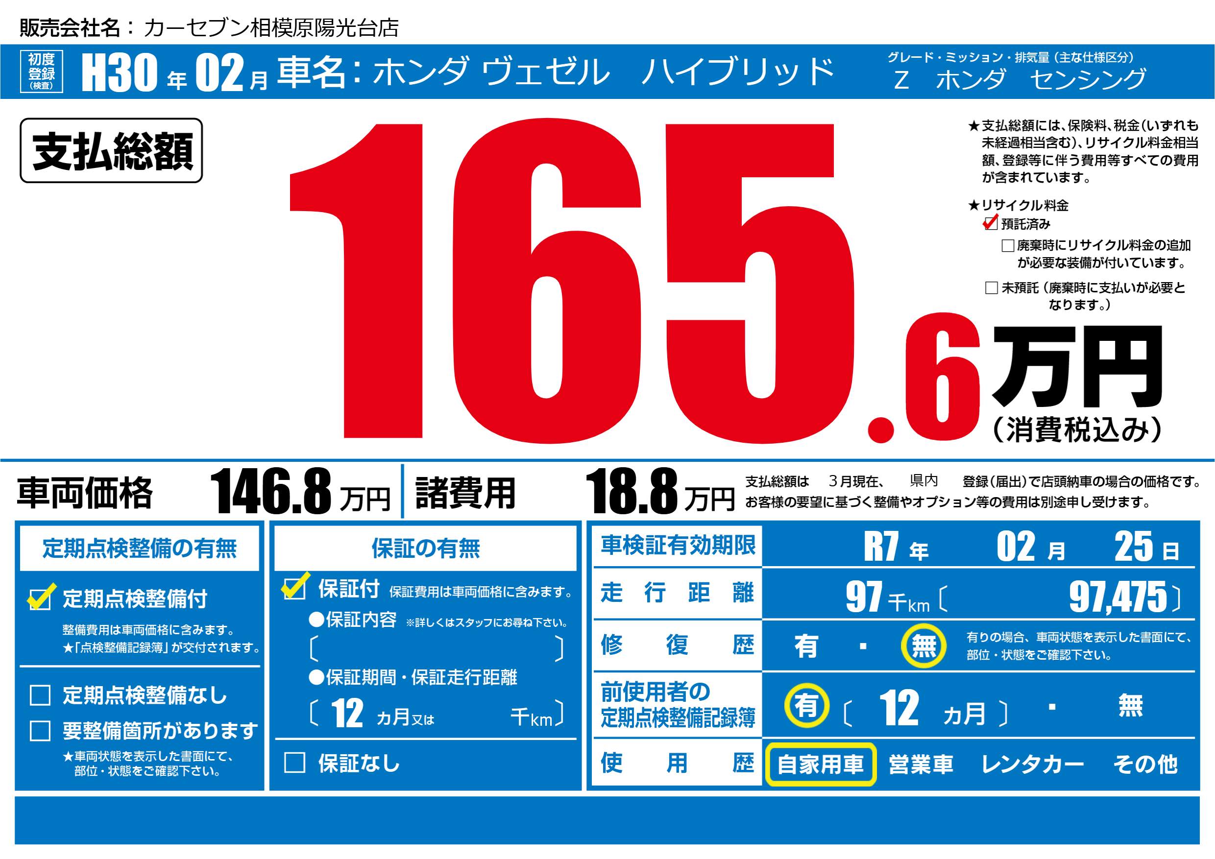 | 車名 | ホンダ ヴェゼル ハイブリッド | グレード ミッション 排気量 |