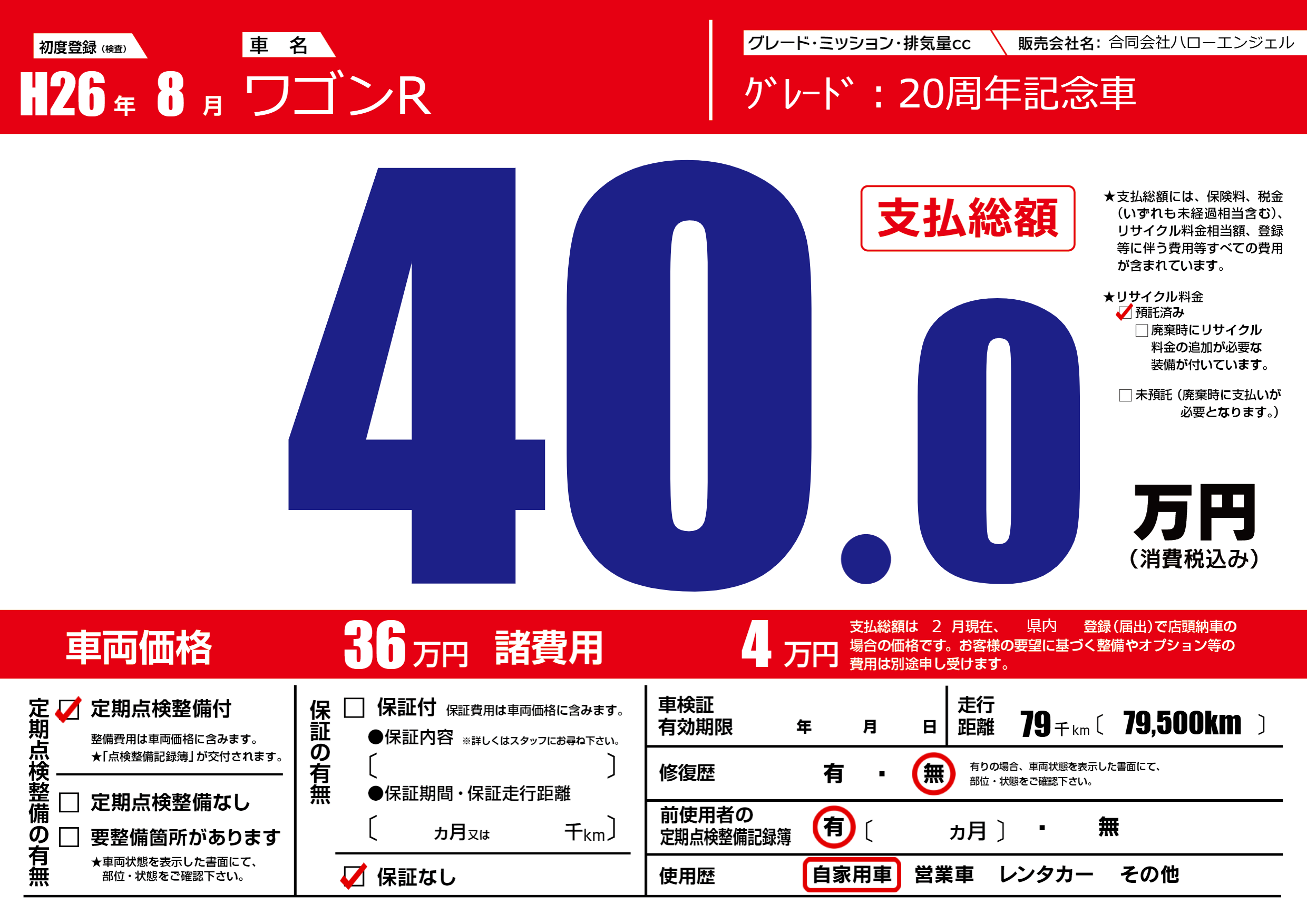 | 車名 | ワゴンR | グレード ミッション 排気量 |