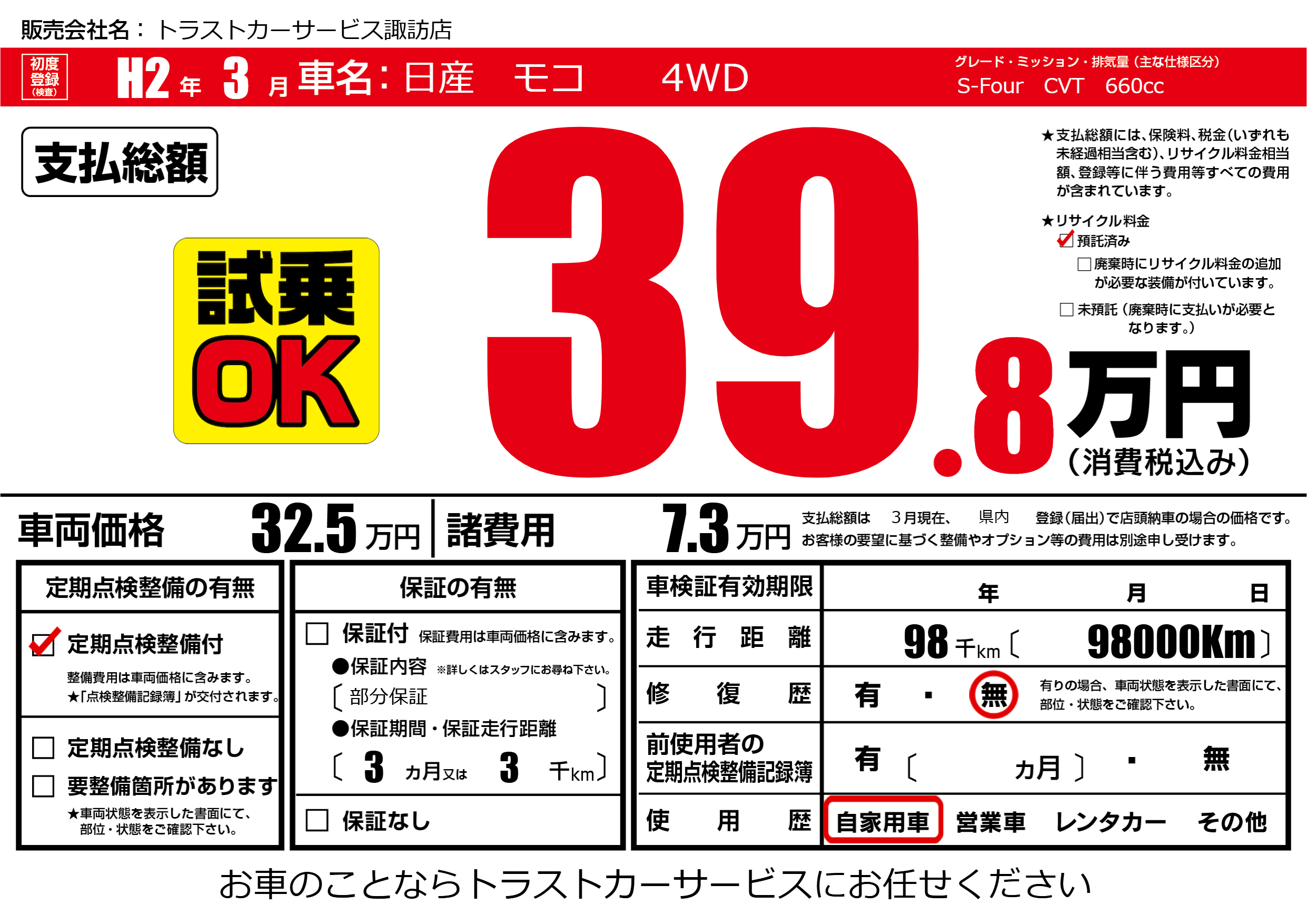 | 車名 | 日産 モコ 4WD | グレード ミッション 排気量 |