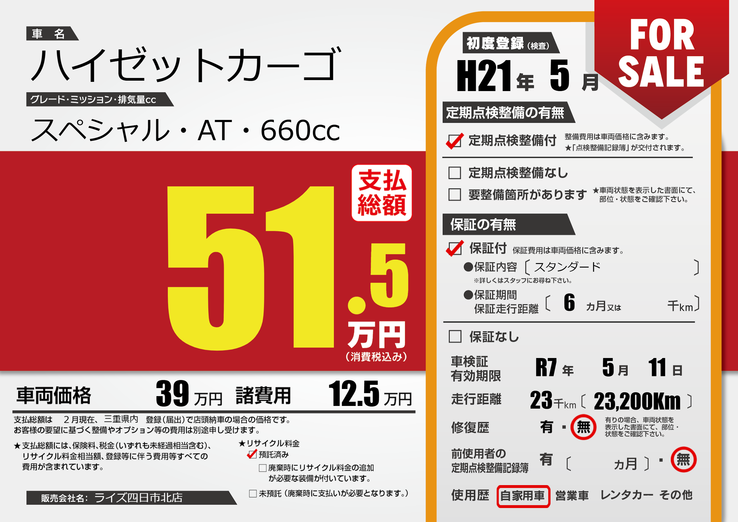| 走行キロ | 2.3万km | 初年度登録 | H21年5月 |