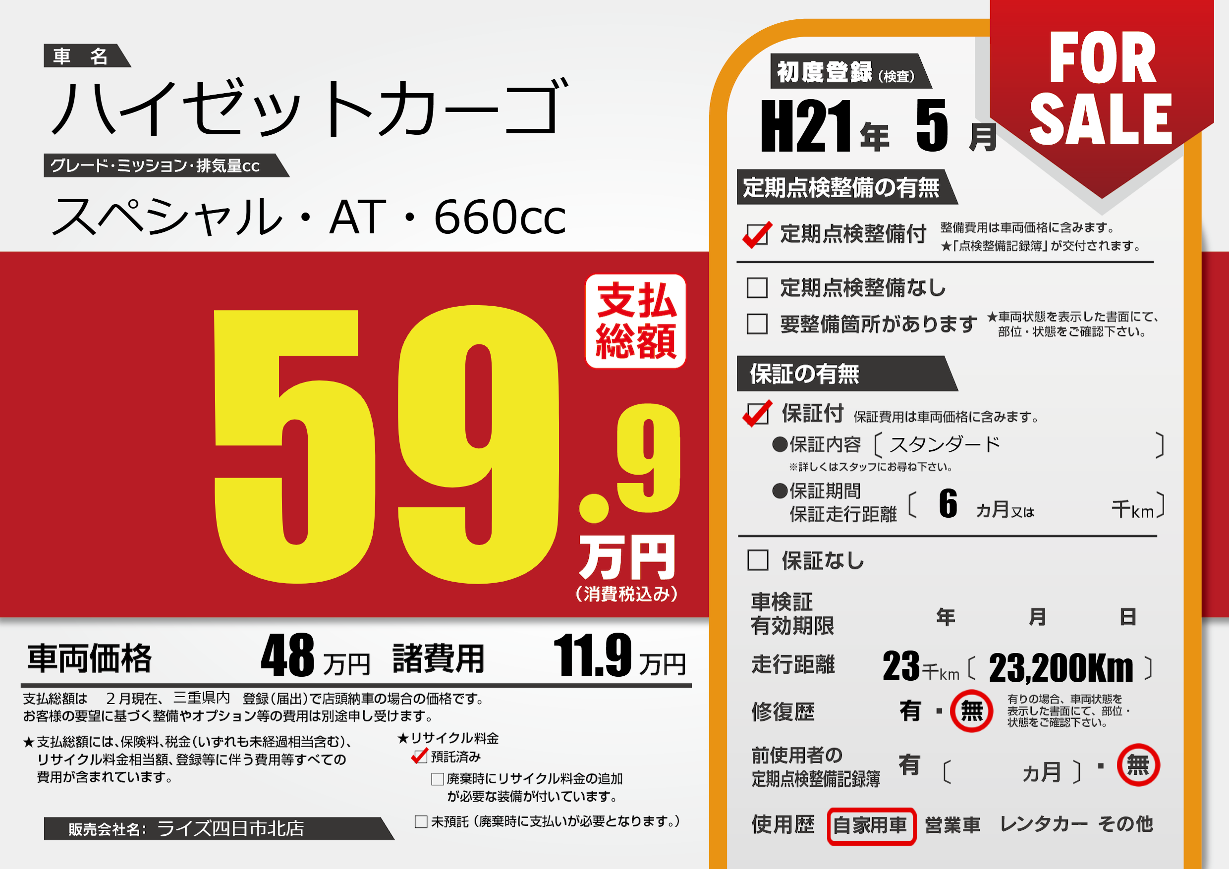 | 車名 | ハイゼットカーゴ | グレード ミッション 排気量 |