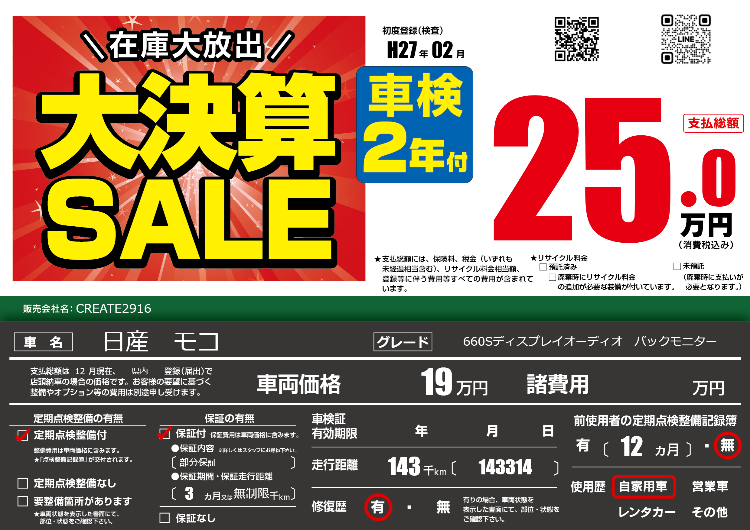 | 走行キロ | 14.3万km | 初年度登録 | H27年02月 |