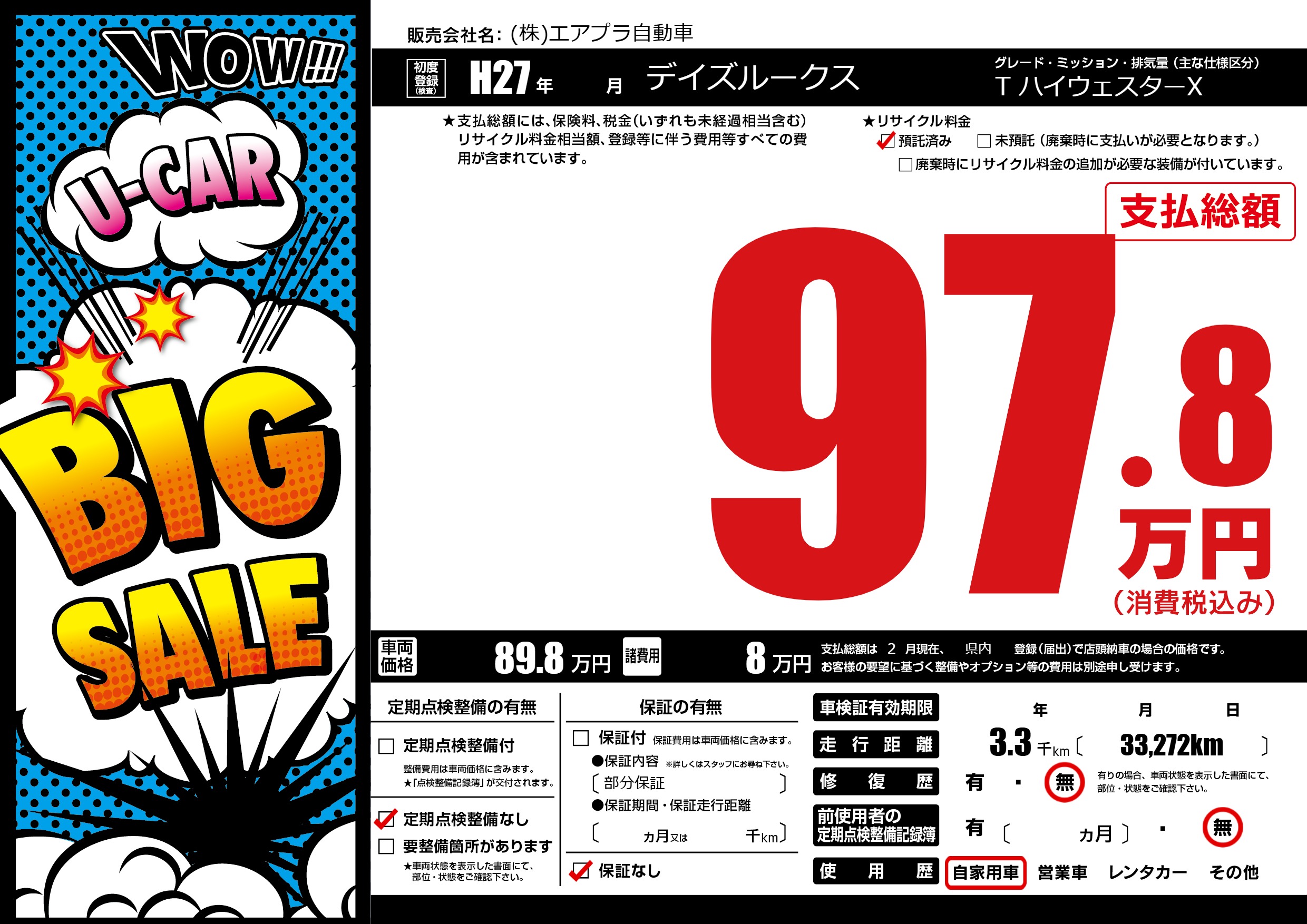 | 走行キロ | 0.3万km | 初年度登録 | H27年---月 |