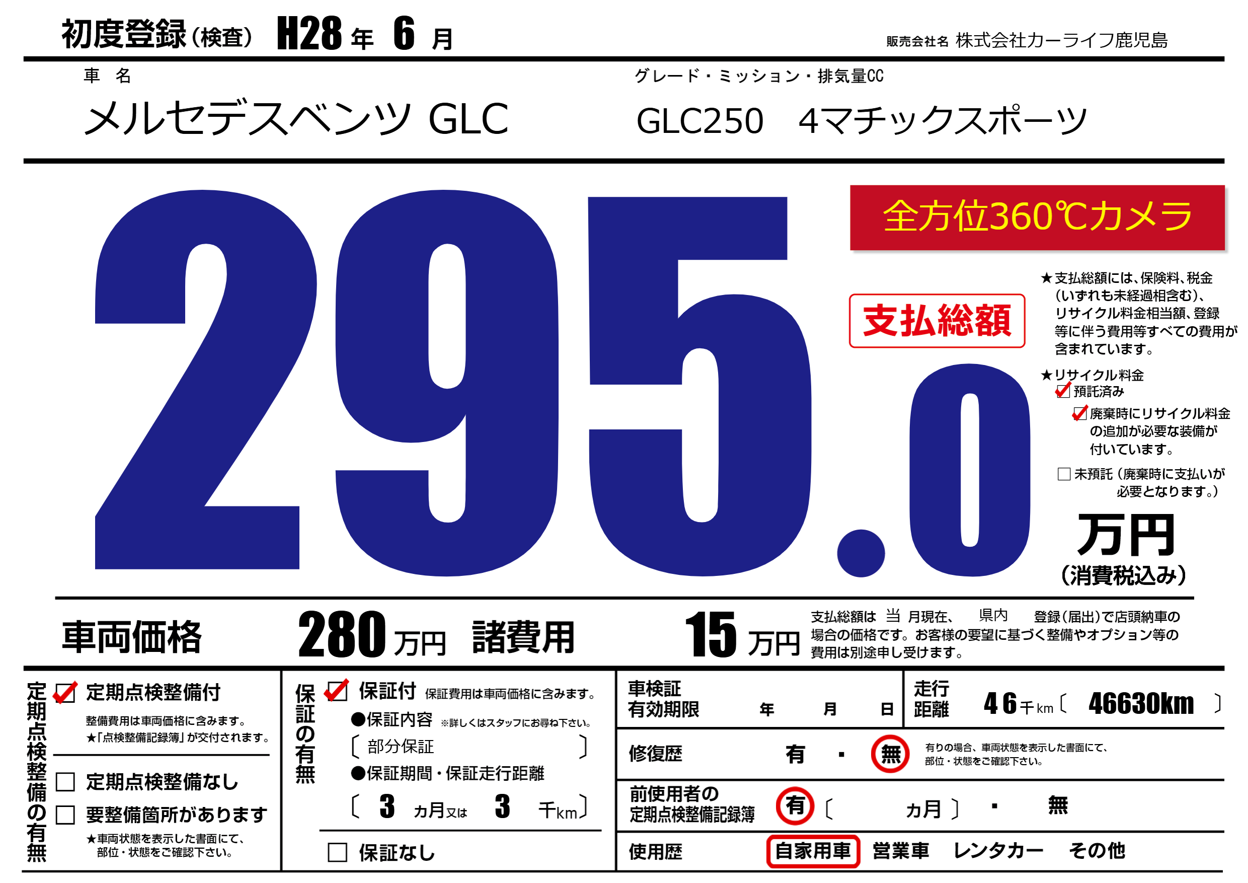 | 車名 | メルセデスベンツ GLC | グレード ミッション 排気量 |