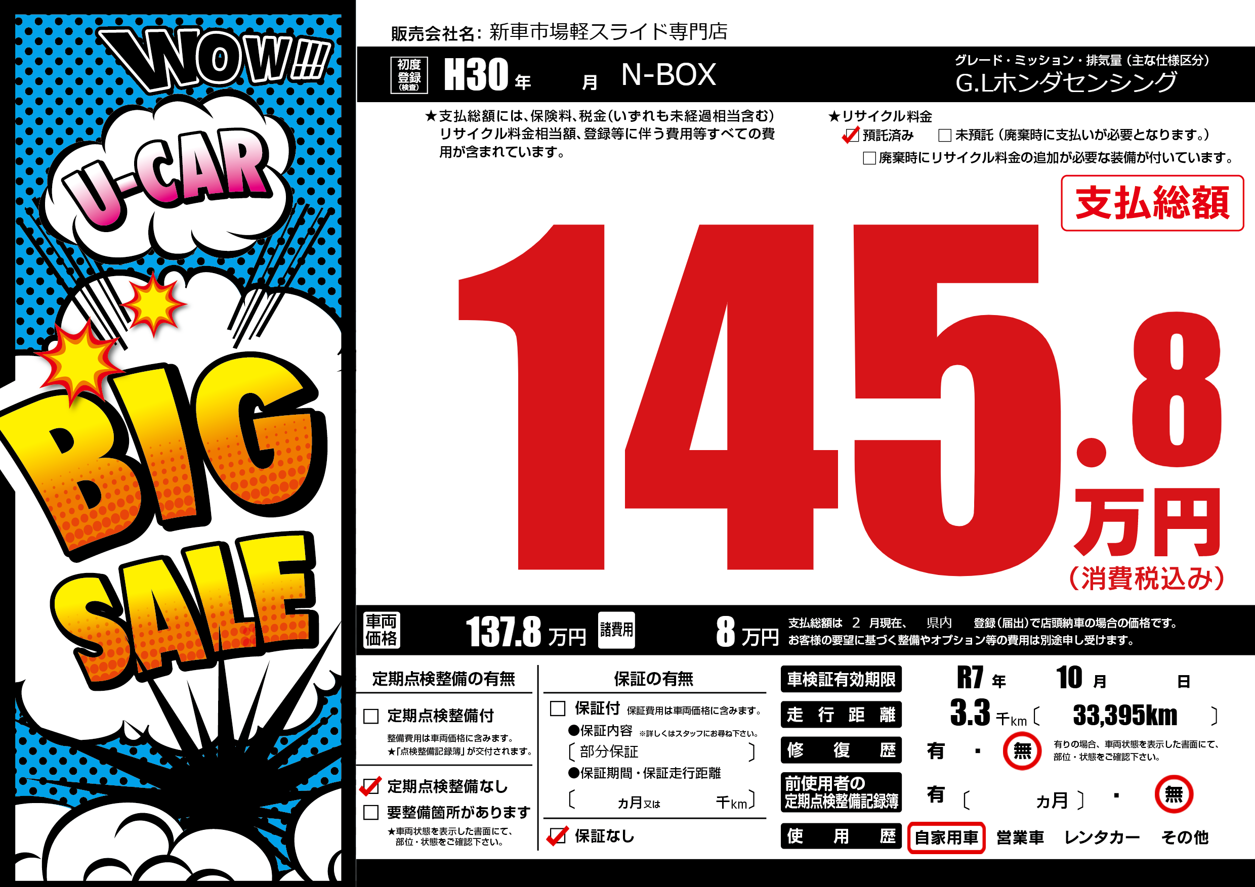 | 走行キロ | 0.3万km | 初年度登録 | H30年---月 |