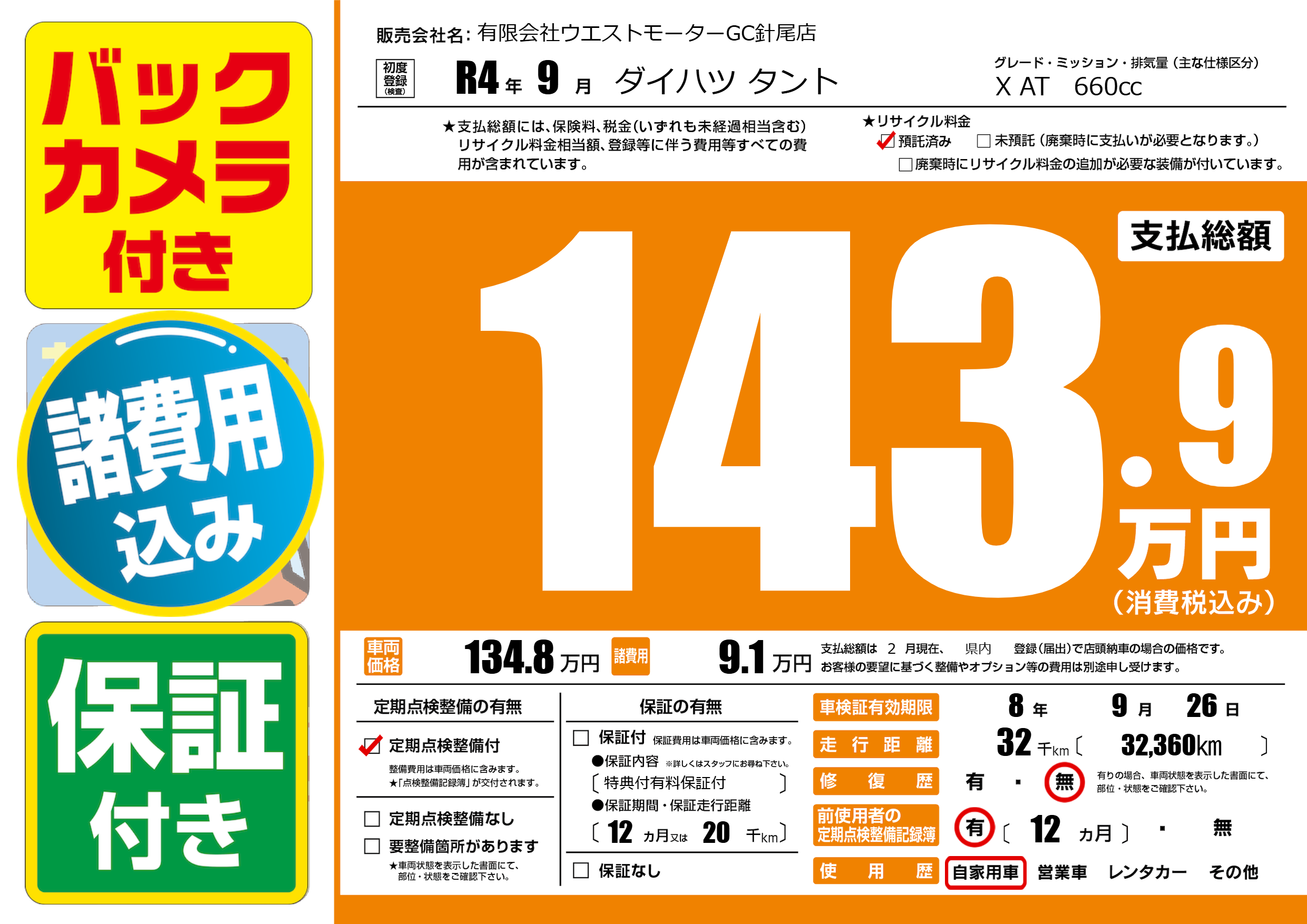 | 車名 | ダイハツ タント | グレード ミッション 排気量 |