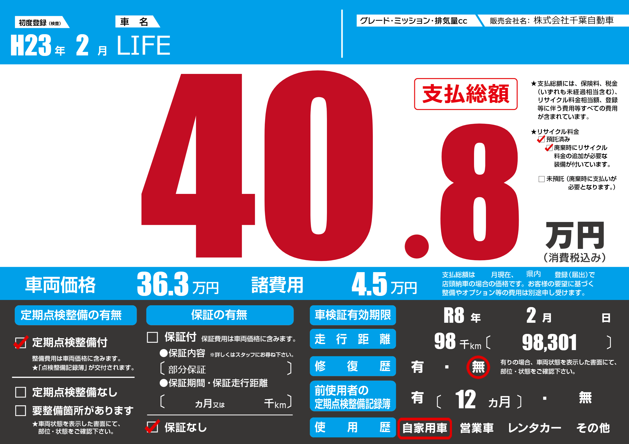 | 車名 | LIFE | グレード ミッション 排気量 |