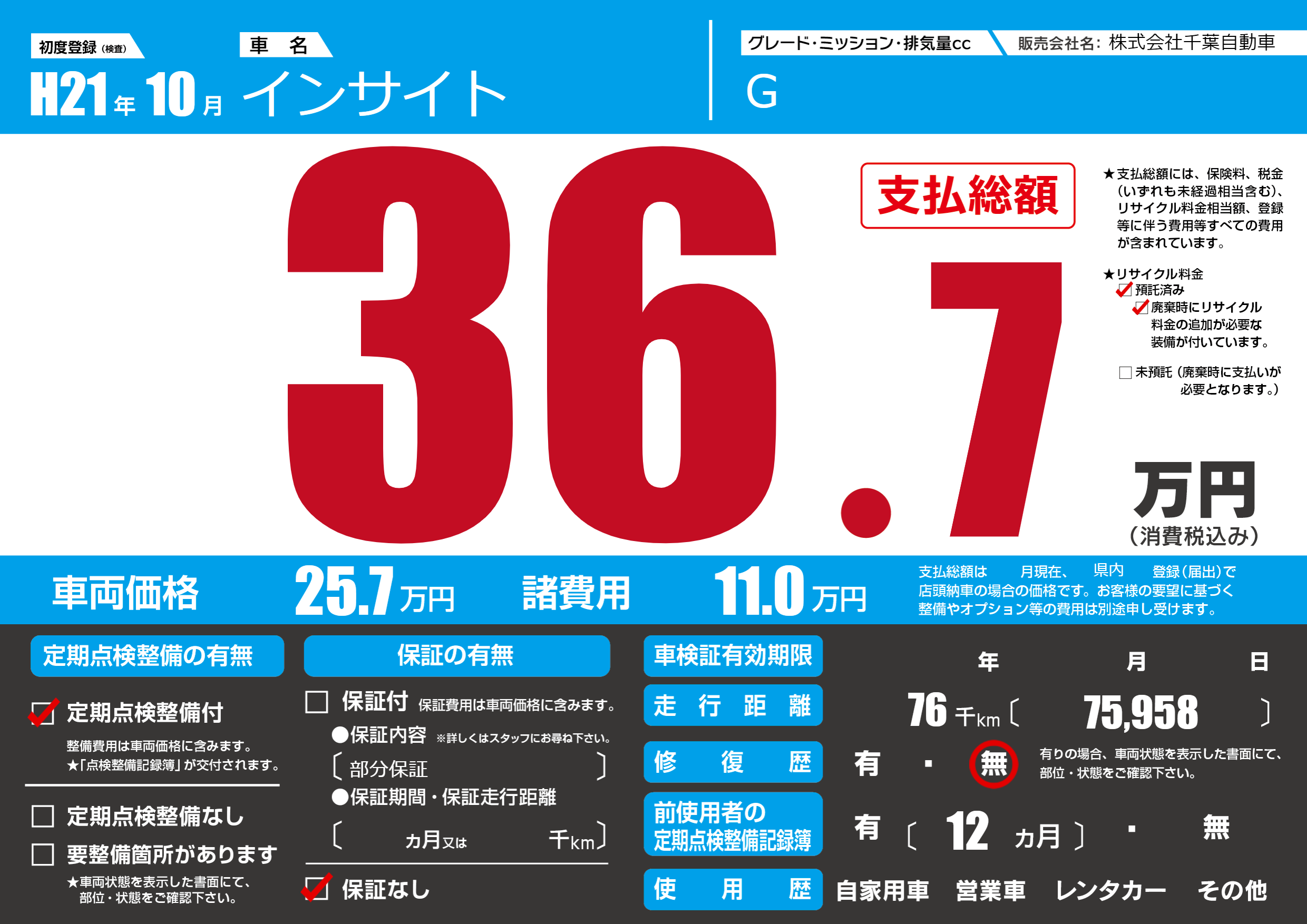 | 車名 | インサイト | グレード ミッション 排気量 |