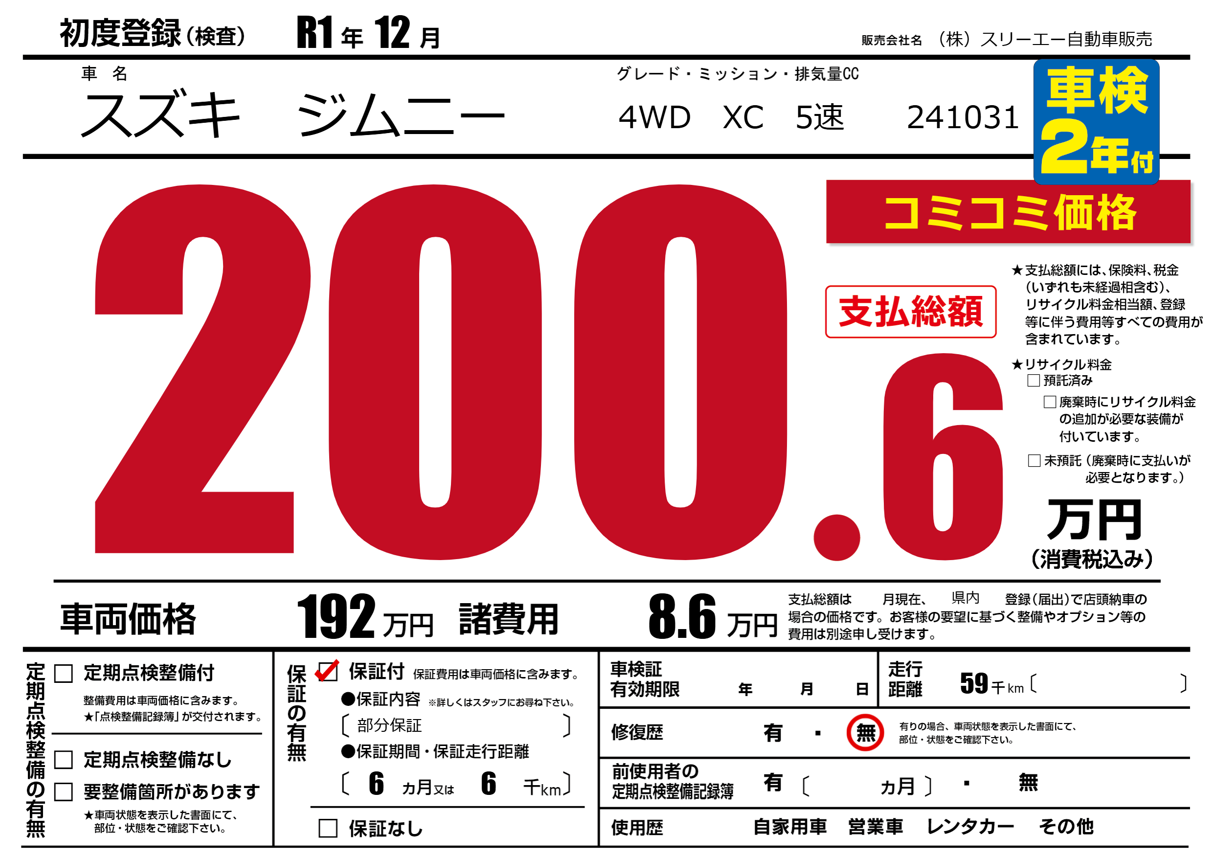| 車名 | スズキ ジムニー | グレード ミッション 排気量 |