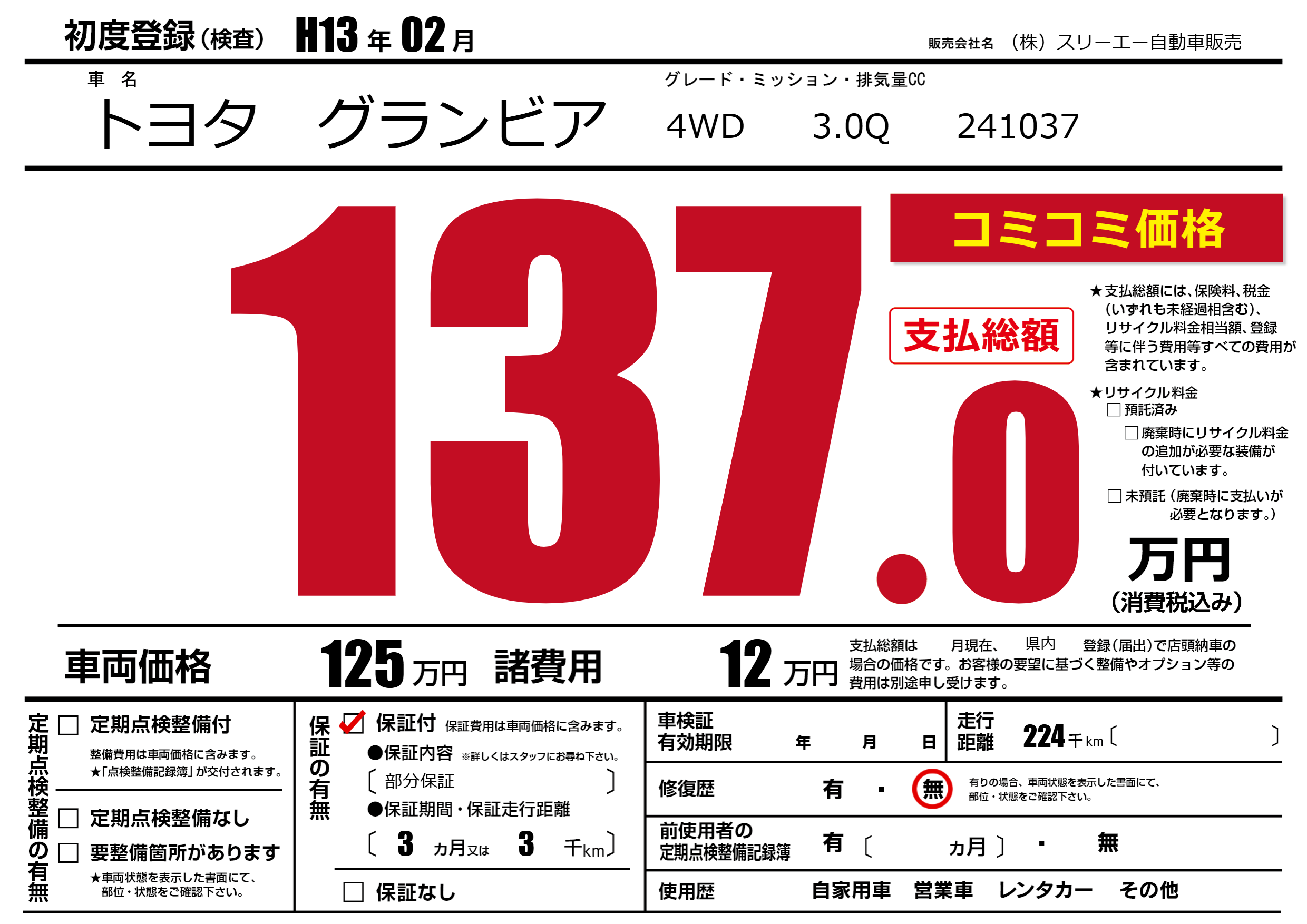 | 走行キロ | 22.4万km | 初年度登録 | H13年02月 |
