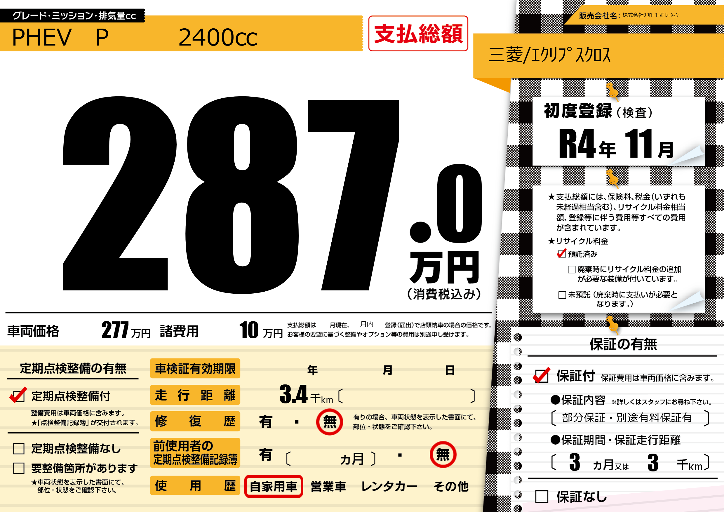 | 車名 | 三菱/エクリプスクロス | グレード ミッション 排気量 |