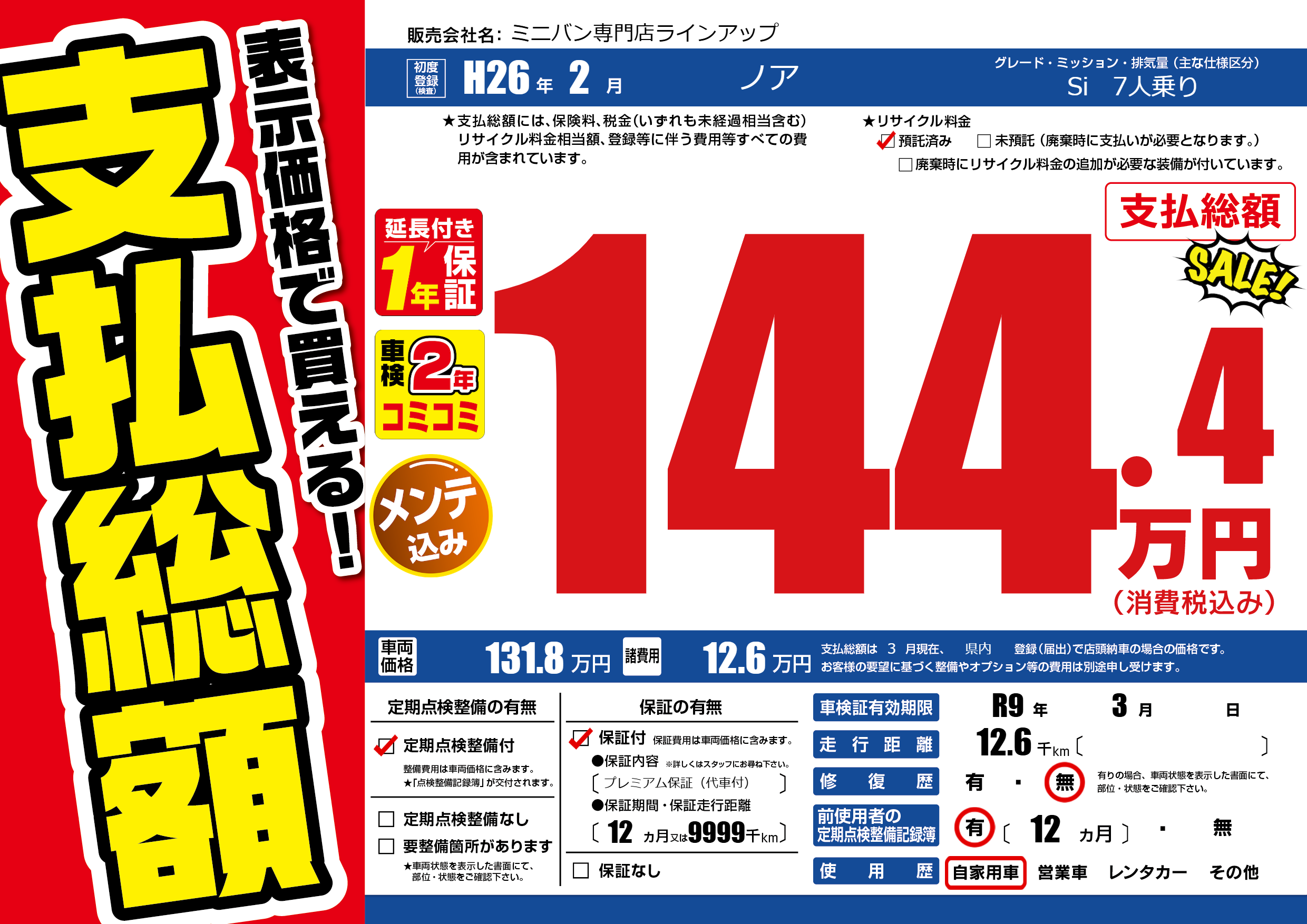 | 走行キロ | 1.2万km | 初年度登録 | H26年2月 |