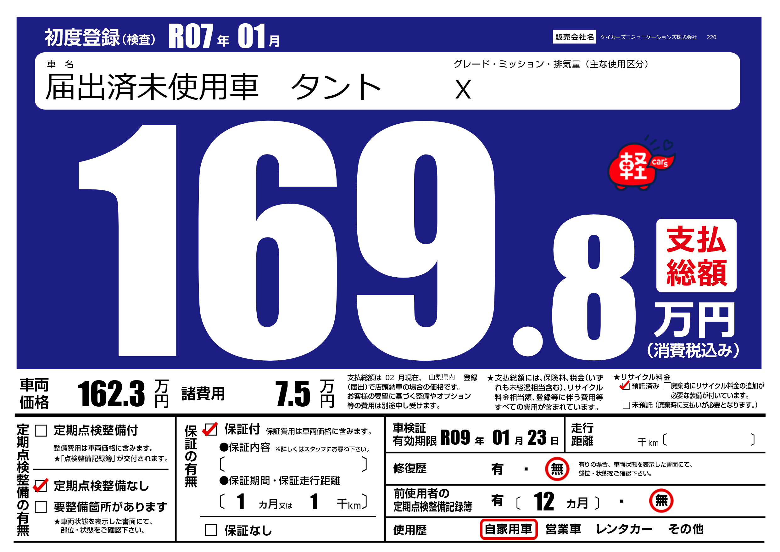 | 車名 | 届出済未使用車 タント | グレード ミッション 排気量 |