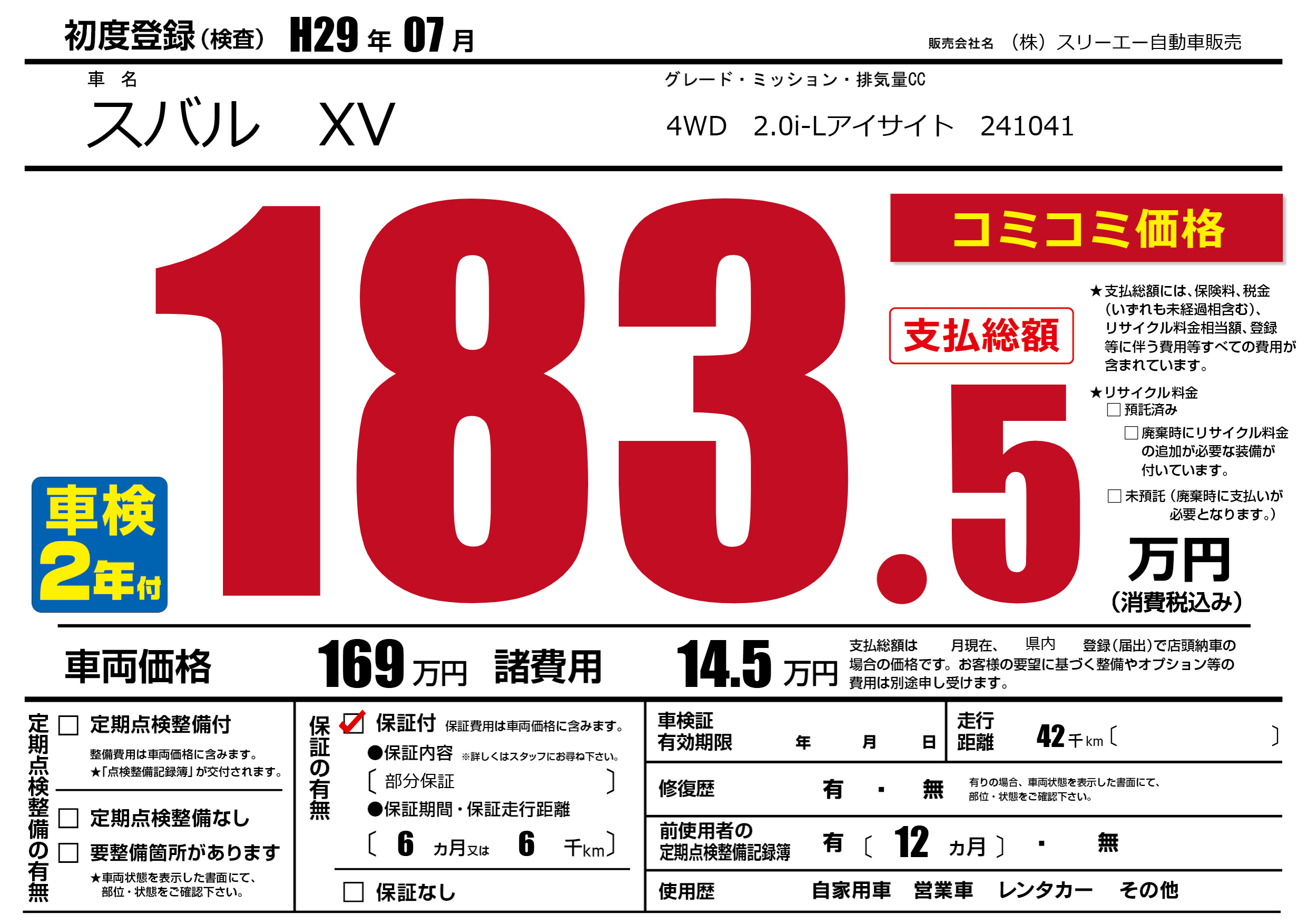 | 車名 | スバル XV | グレード ミッション 排気量 |