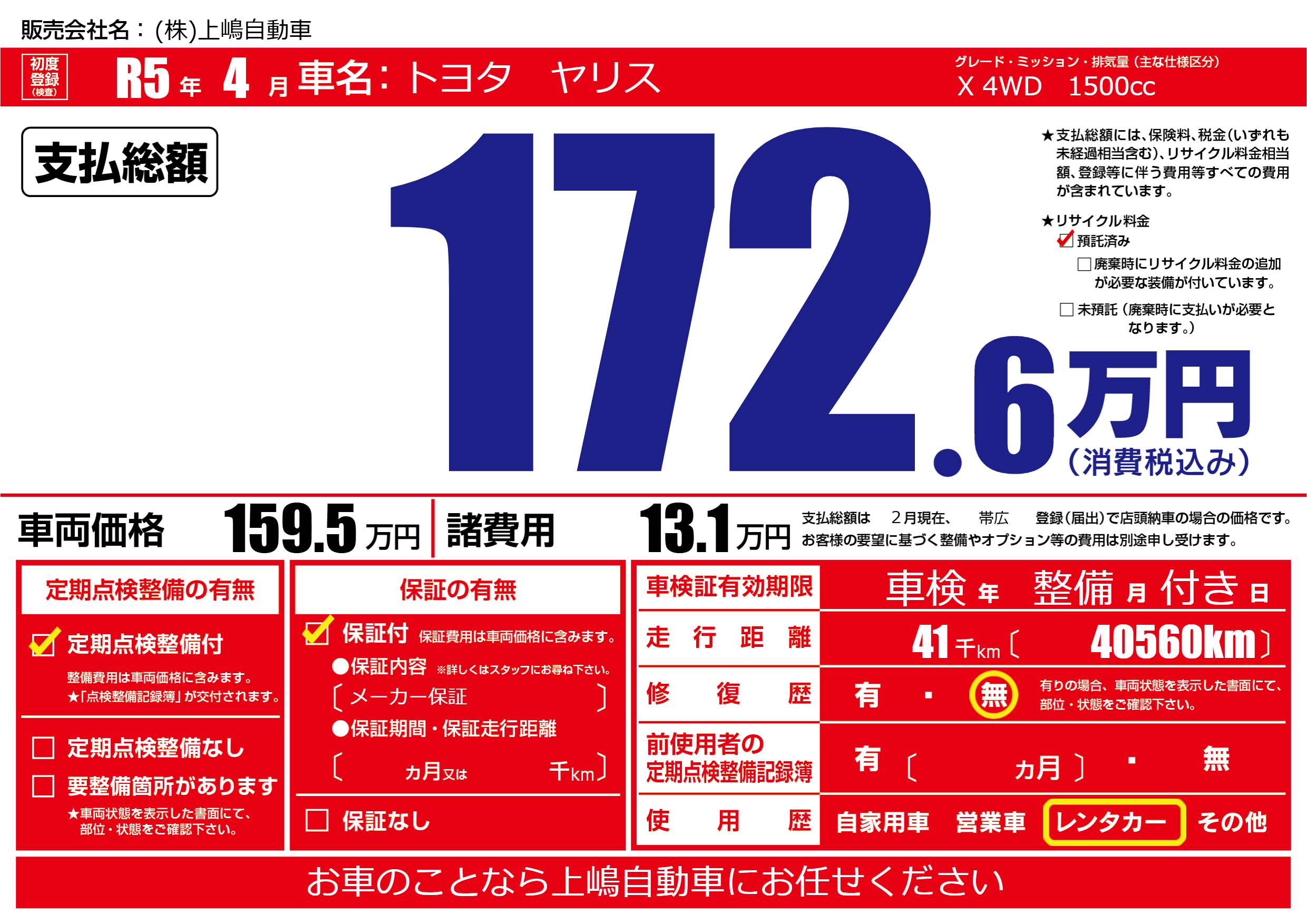 | 車名 | トヨタ ヤリス | グレード ミッション 排気量 |