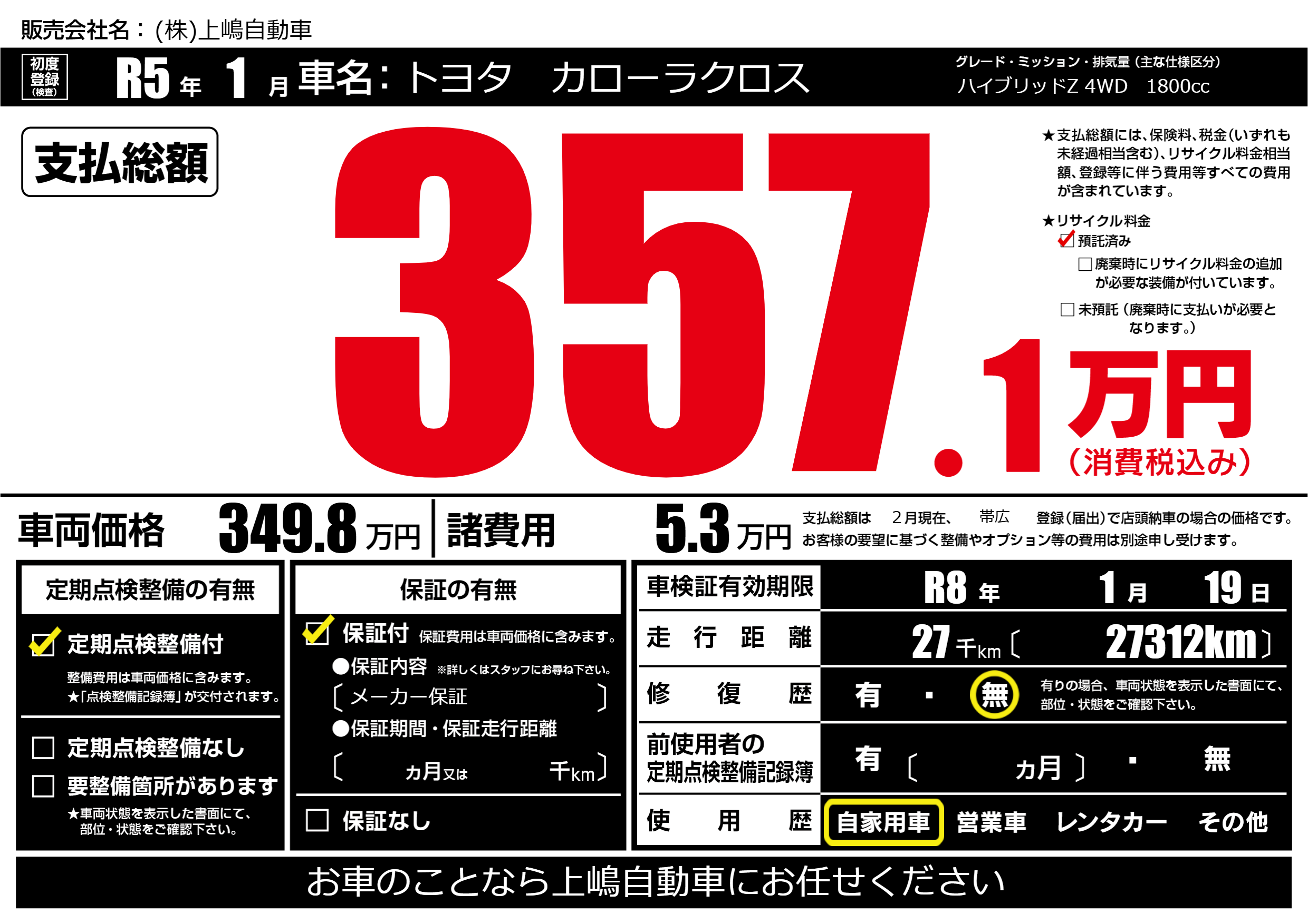 | 走行キロ | 2.7万km | 初年度登録 | R5年1月 |