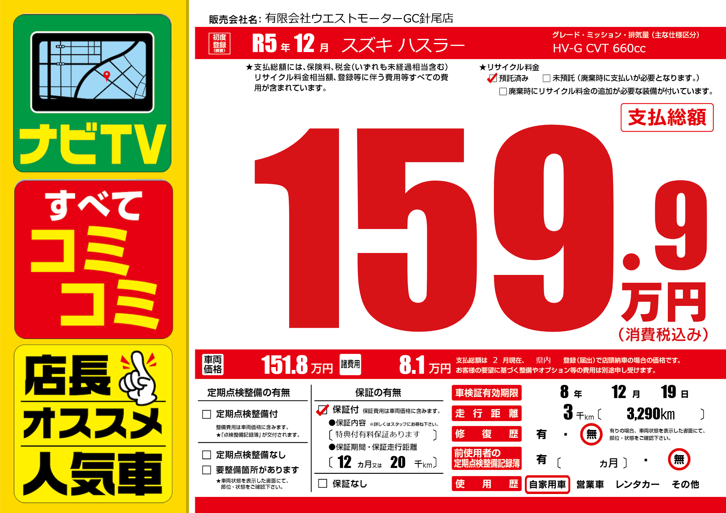 | 走行キロ | 0.3万km | 初年度登録 | R5年12月 |