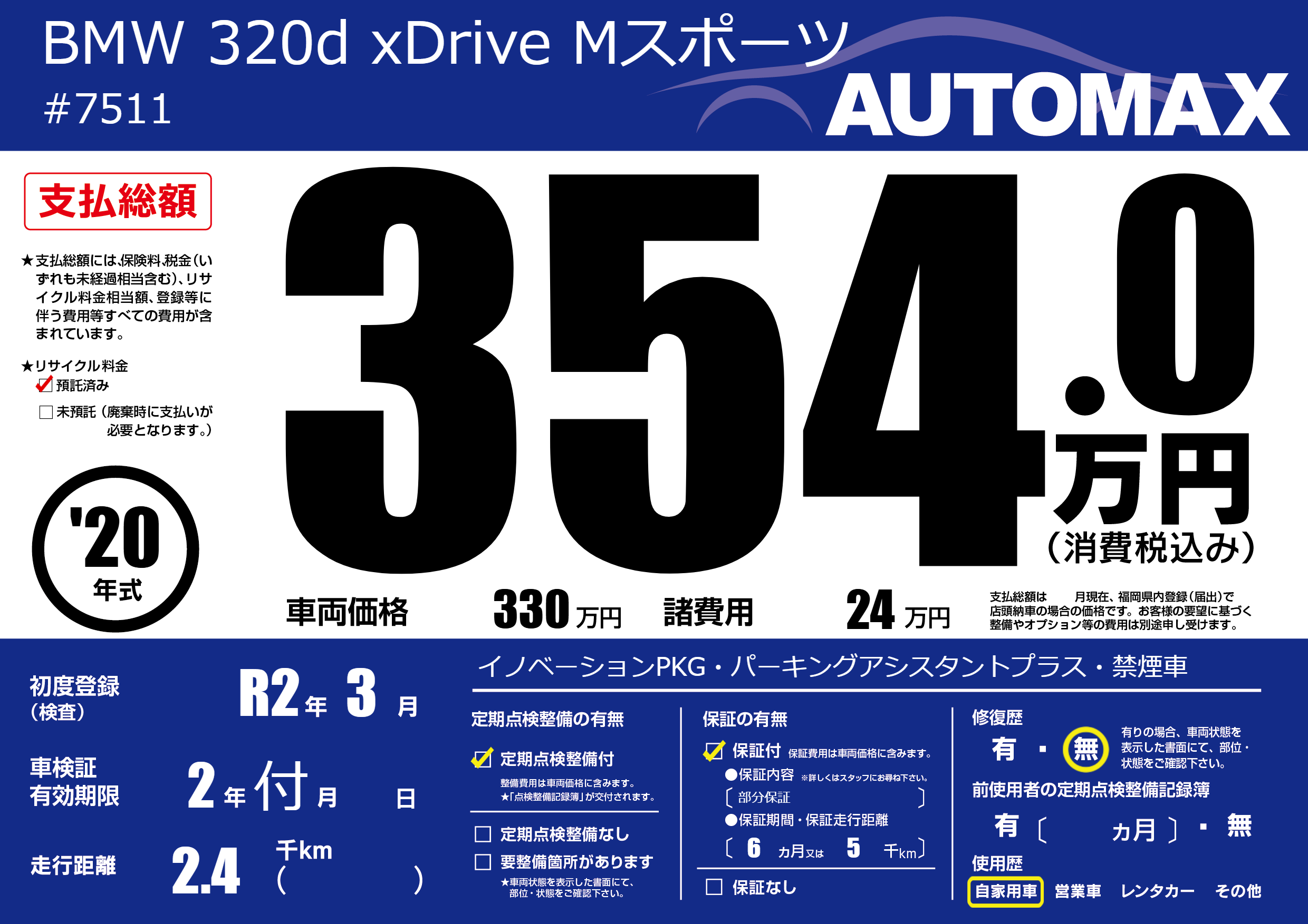 | 車名 | BMW 320d xDrive Mスポーツ | グレード ミッション 排気量 |