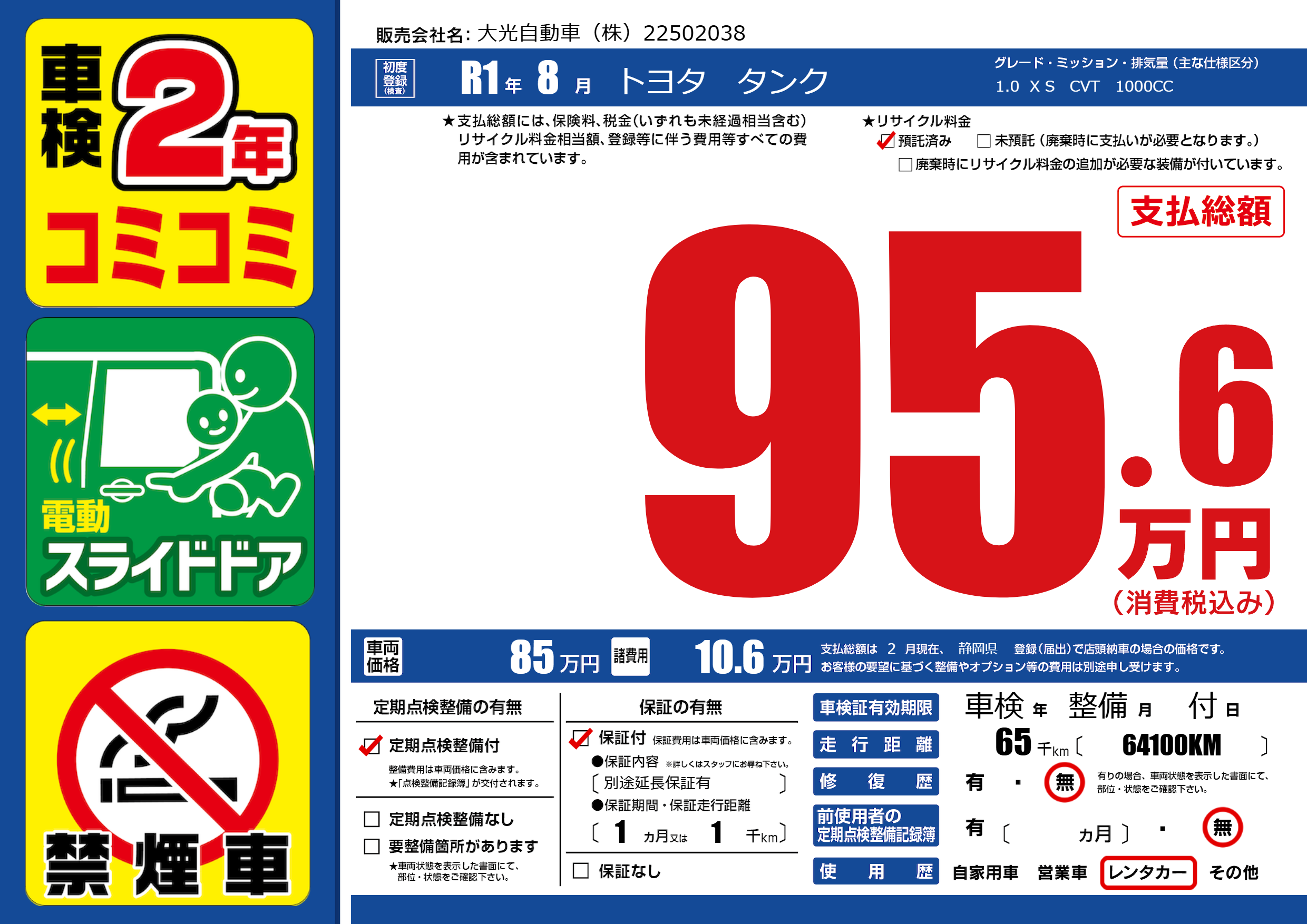 | 車名 | トヨタ タンク | グレード ミッション 排気量 |