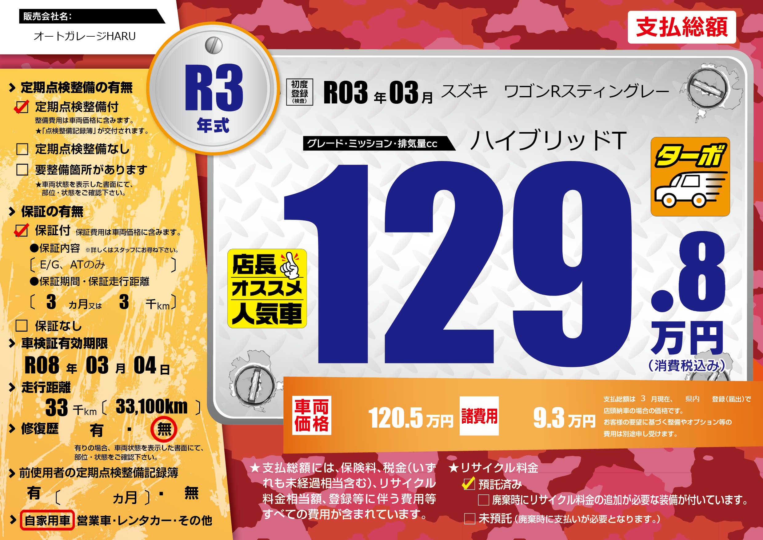 | 走行キロ | 3.3万km | 初年度登録 | R03年03月 |