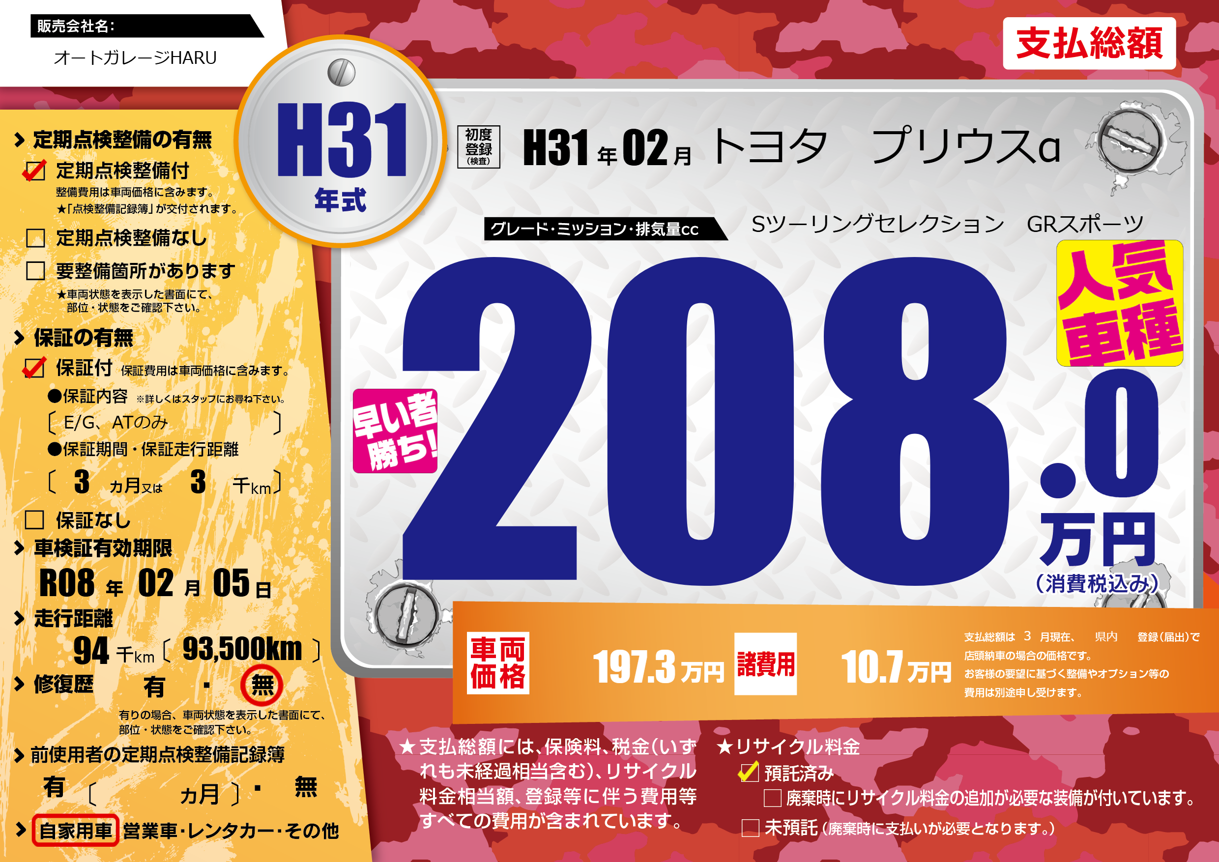 | 車名 | トヨタ プリウスα | グレード ミッション 排気量 |