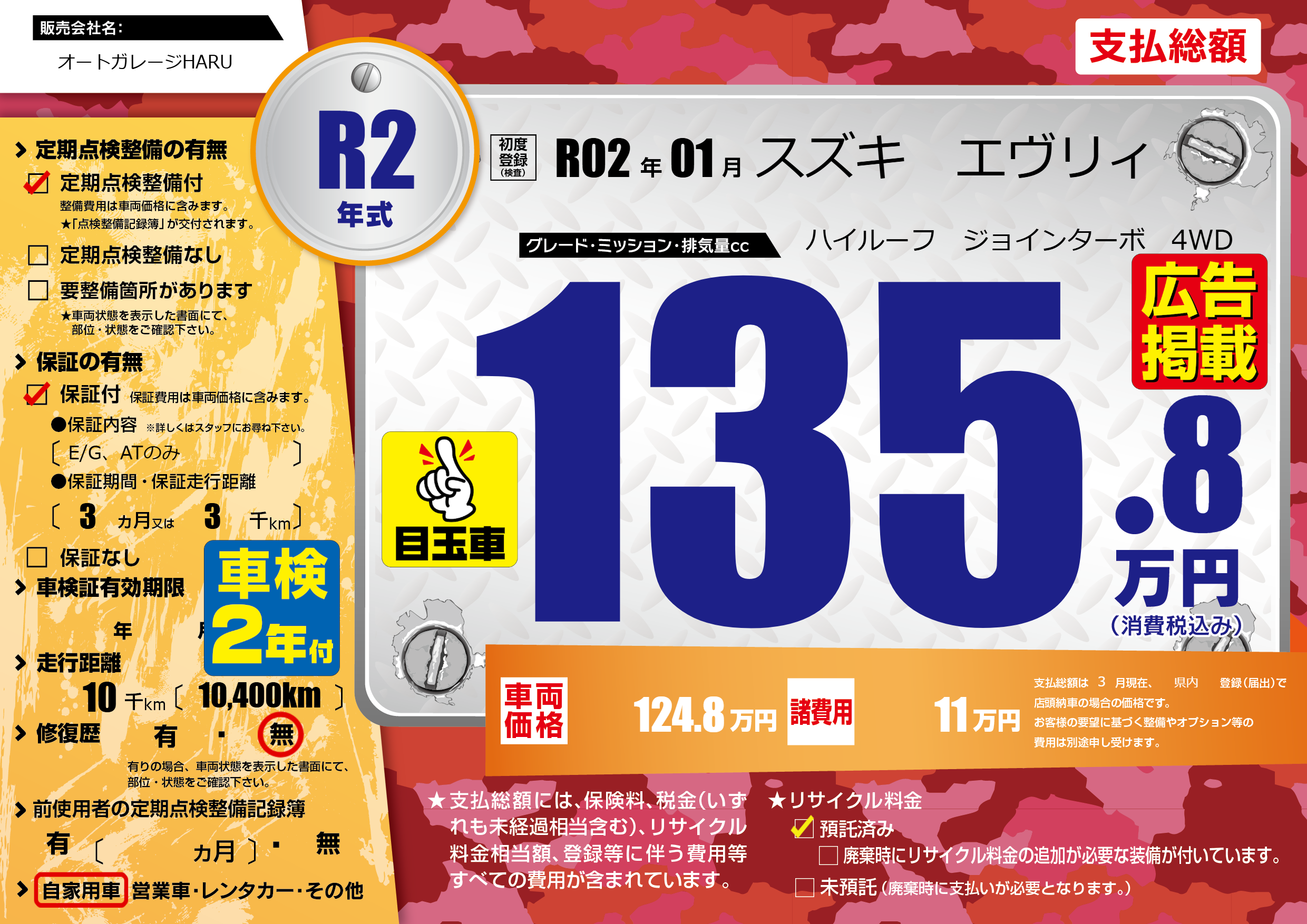 | 車名 | スズキ エヴリィ | グレード ミッション 排気量 |