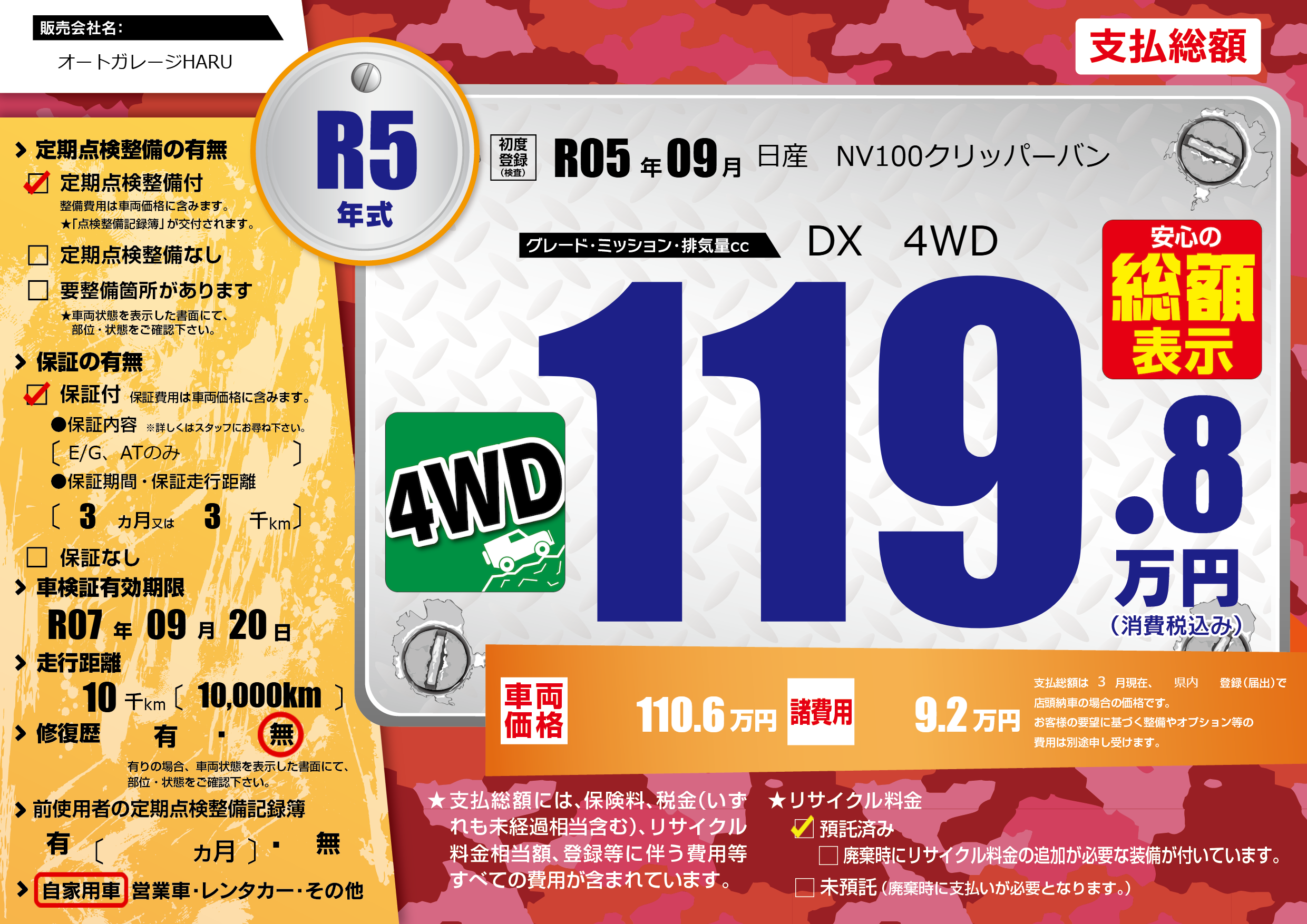 | 車名 | 日産 NV100クリッパーバン | グレード ミッション 排気量 |
