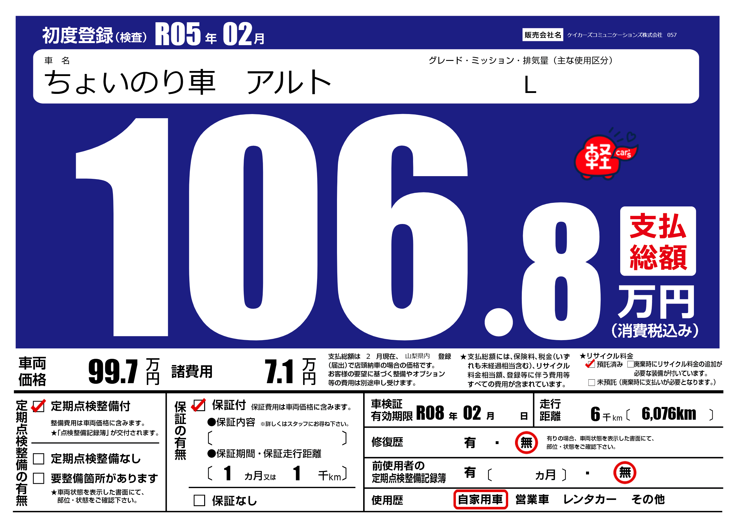 | 車名 | ちょいのり車 アルト | グレード ミッション 排気量 |