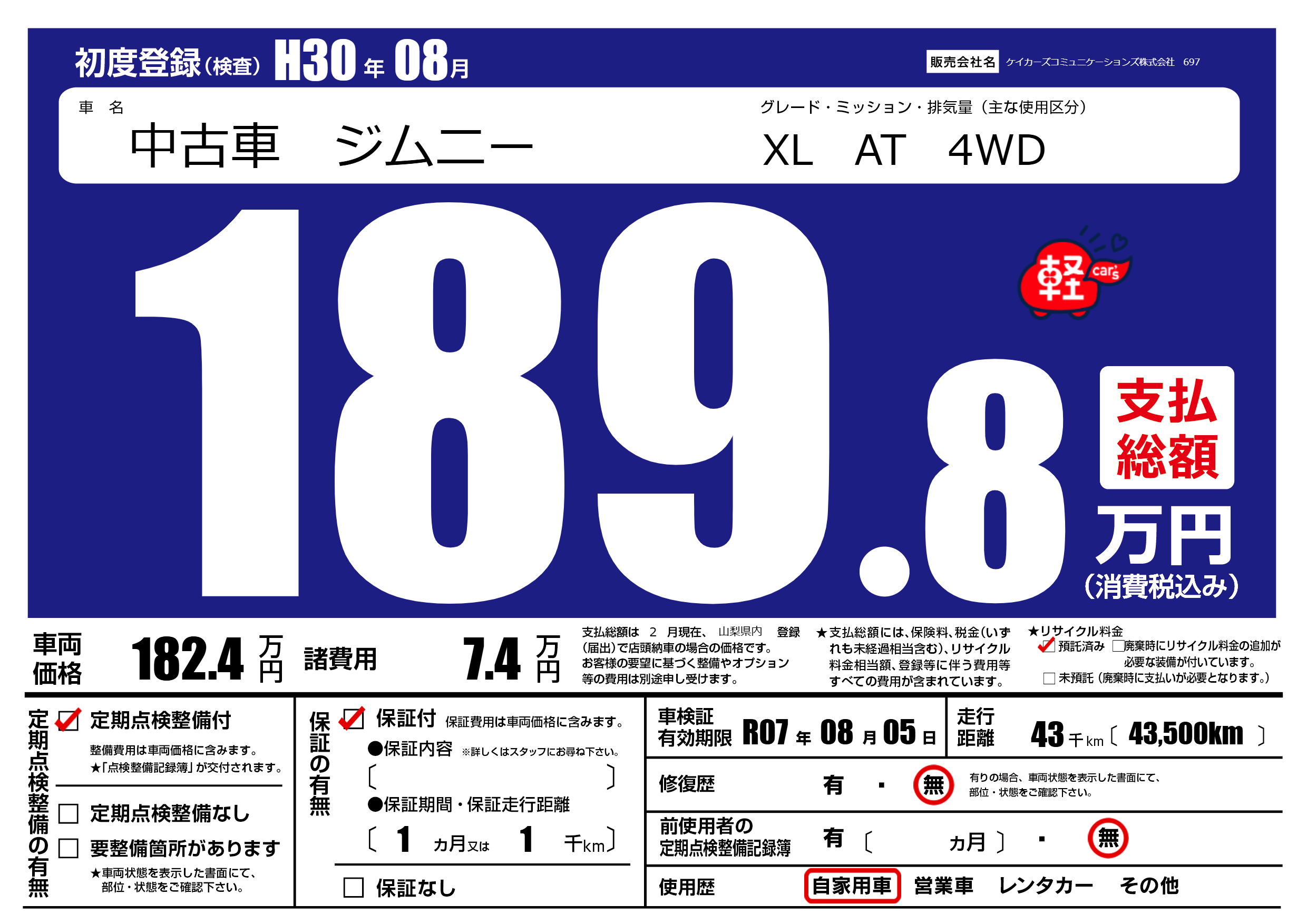 | 走行キロ | 4.3万km | 初年度登録 | H30年08月 |
