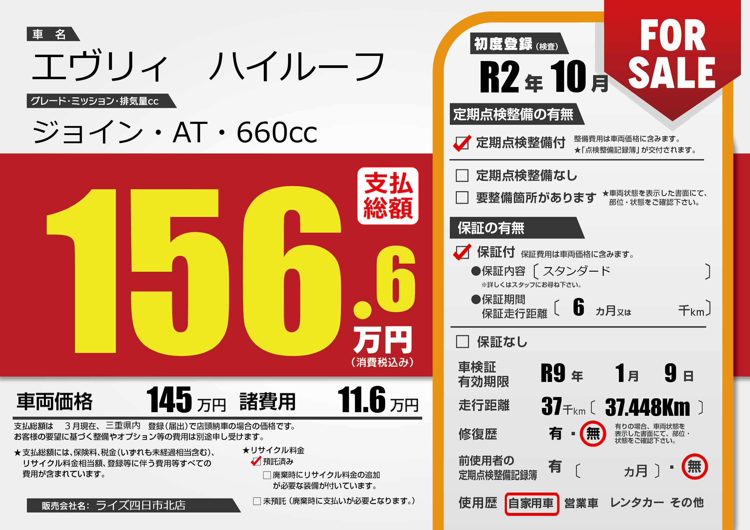 | 車名 | エヴリィ ハイルーフ | グレード ミッション 排気量 |