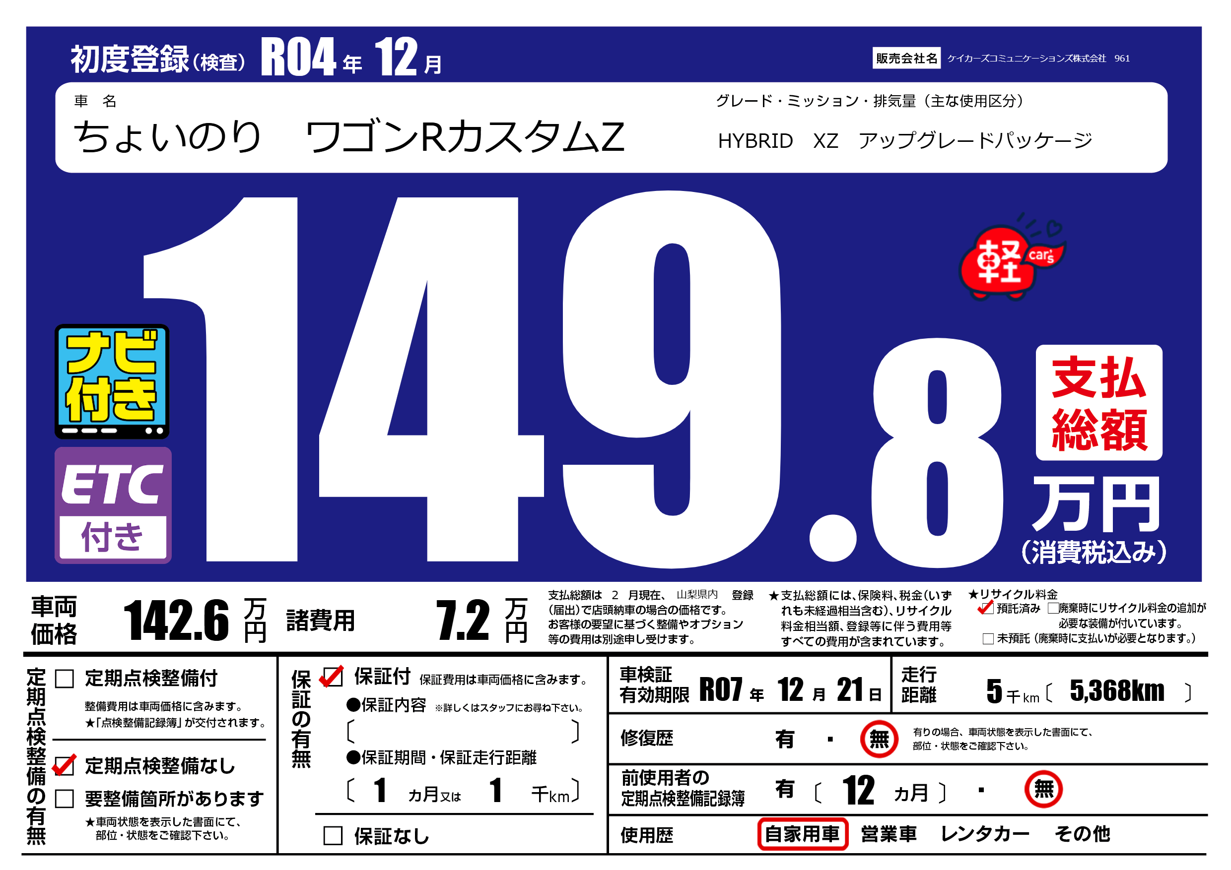 | 走行キロ | 0.5万km | 初年度登録 | R04年12月 |