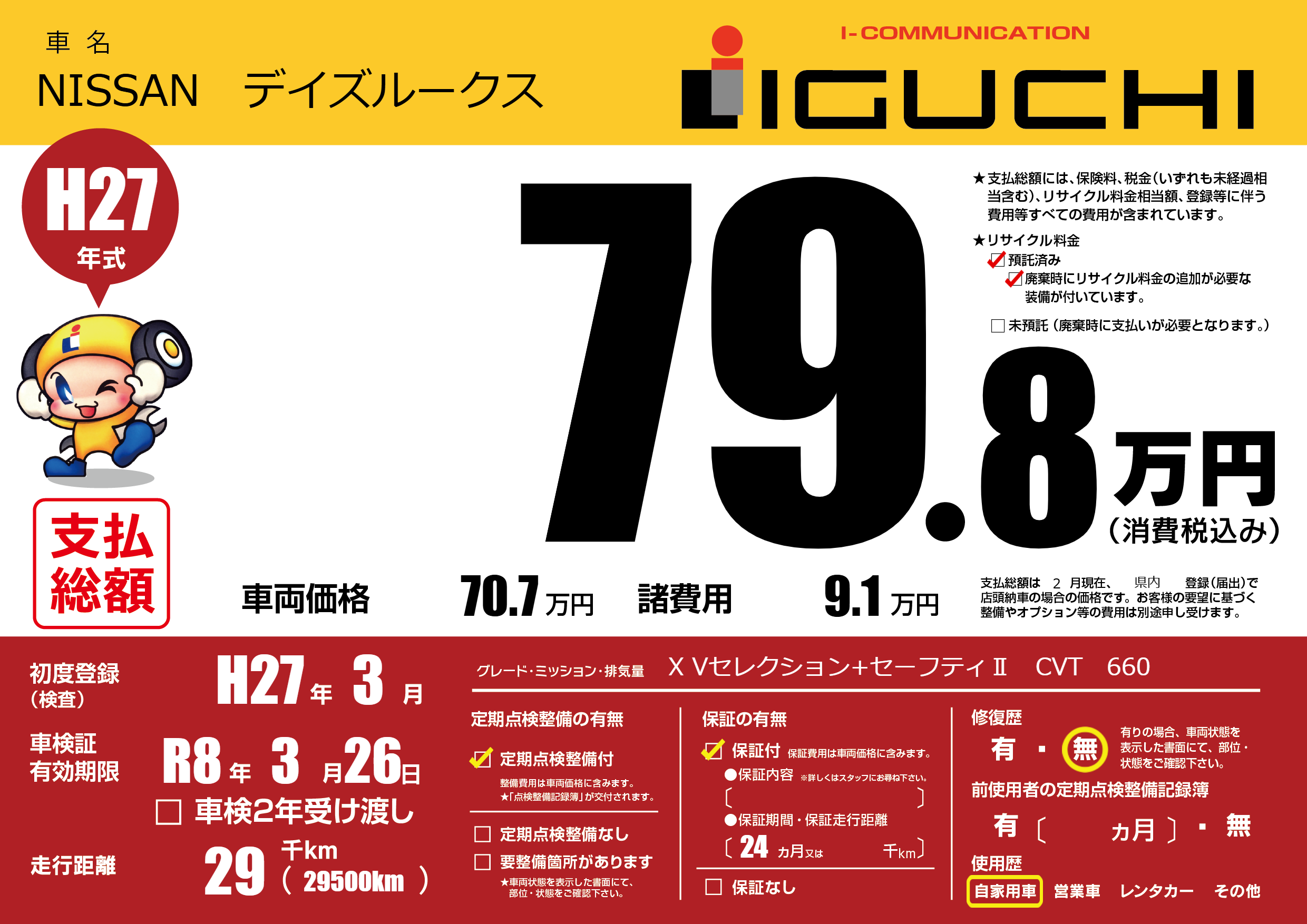| 走行キロ | 2.9万km | 初年度登録 | H27年3月 |